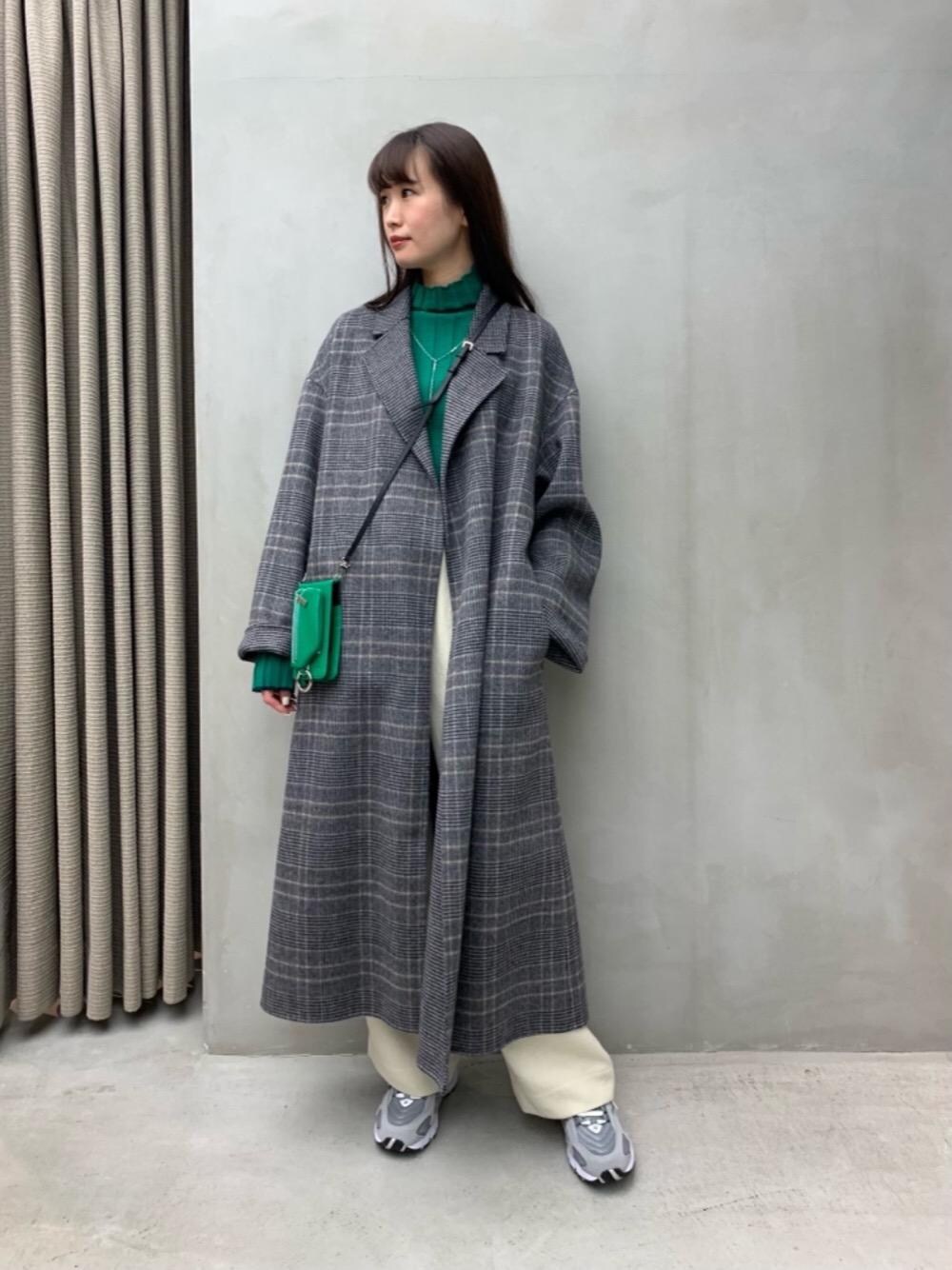 ●身長:161cm ●普段サイズ アウターS.M/トップスFREE/ボトムスS.M/シューズ23cm 【サイズ感】 アウター:ゆったりめ トップス:程よいフィット感 パンツ:大きめ シューズ:標準的 【着心地・素材感】 アウター: 一重仕立てで軽やか トップス:さらりとした着心地 パンツ:しっかりとした厚手の生地感 【コーディネートポイント】 トレンドのグリーンを差し色とした、モードカジュアルなスタイリング。 リバーコートには共地のサッシュベルトが付きますが、抜け感を出したい時は付けないのがオススメ。 パッチポケットのドロストパンツはリラックス感があり、着回ししやすいアイテムです。