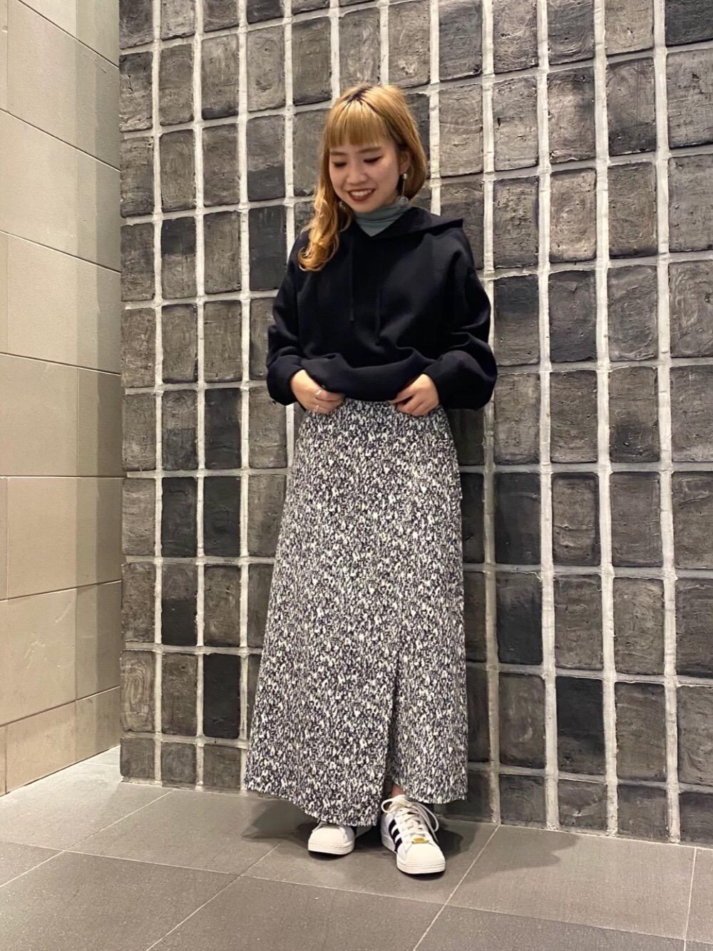 モノトーンの巻きスカートにパーカー、女性らしさを+するためインナーにライムのタートルをインしました! 巻きスカートのキレイ目になりがちな部分をパーカーとスーパースターを履くことでカジュアルに仕上げてあります!