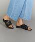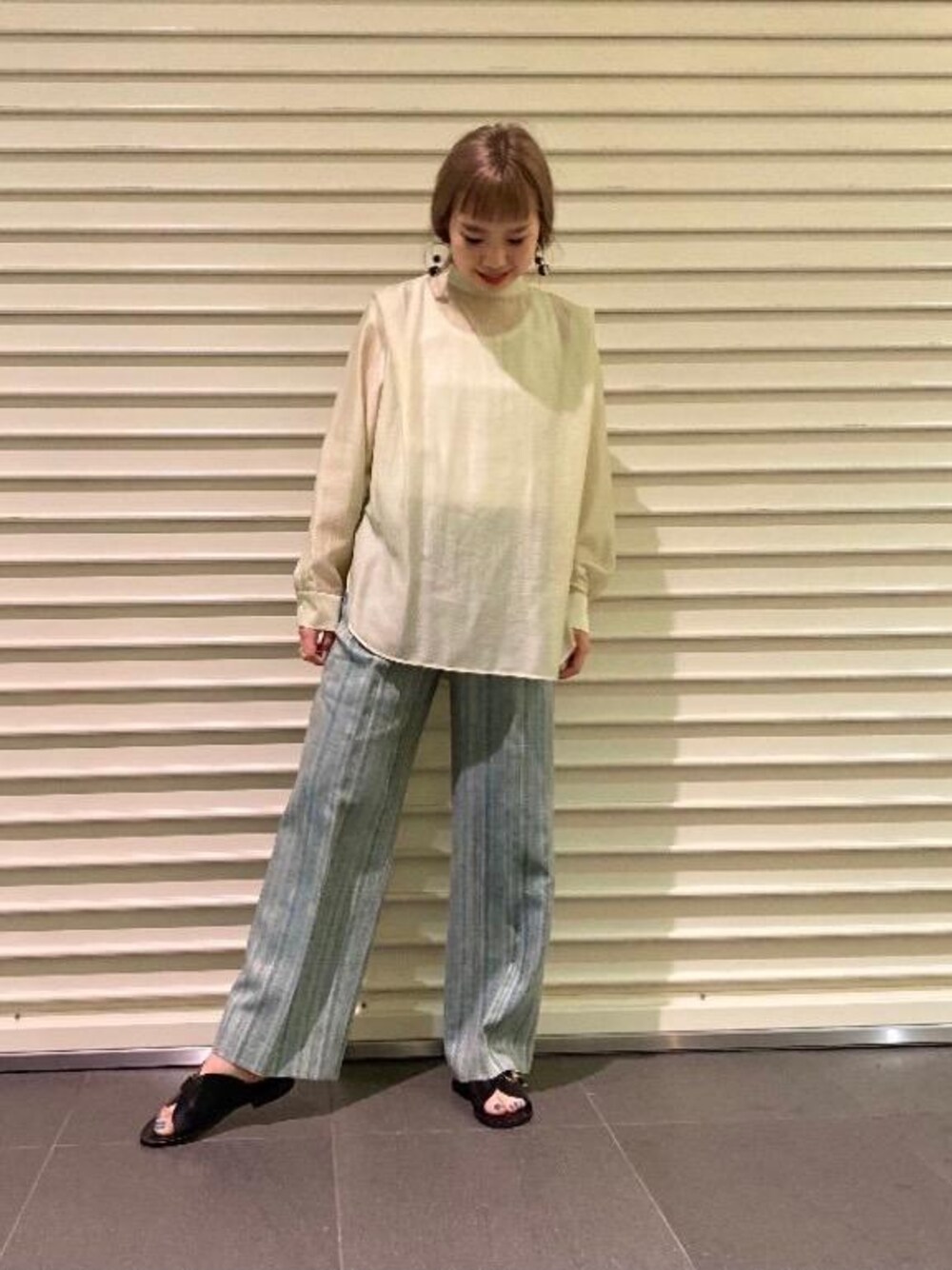 全体を春らしいグリーンのグラデーションでまとめ、足元はブラックのレザーサンダルで合わせました!透け感があるトップスは、これからの時期暑さが出てきても長く使って頂ける一着となっております!