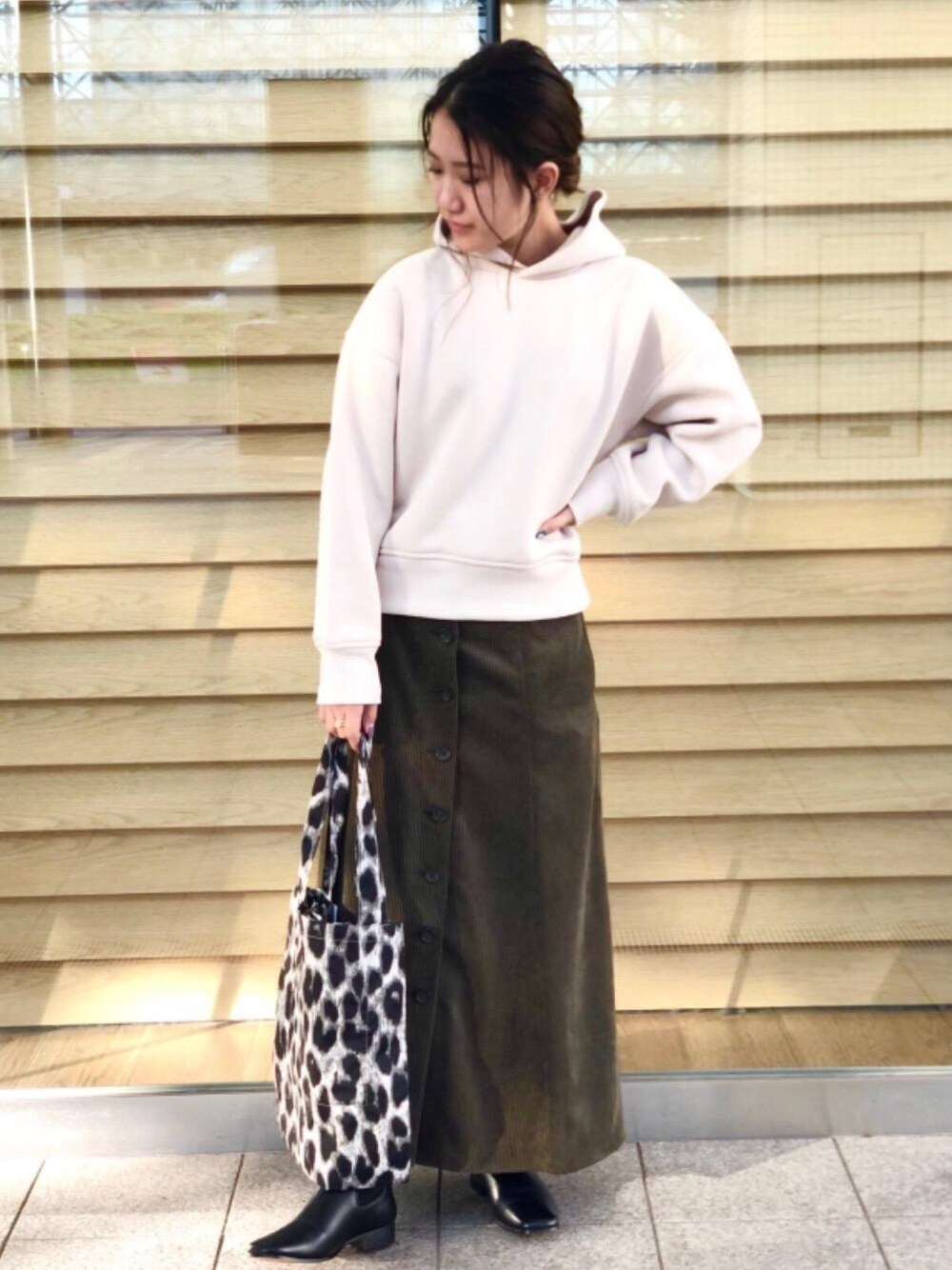 全体的にゆるっとした印象ですが、足元はブーツを合わせ、細く締まったラインを作り、カジュアル過ぎない女性らしいコーディネートにしました。