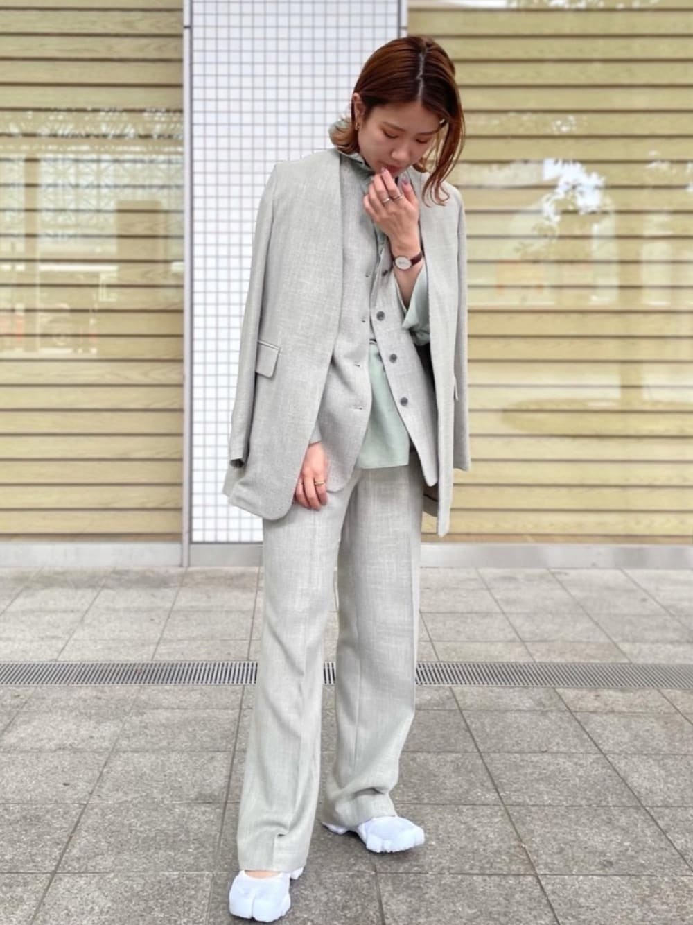 メンズライクなセットアップに首元のフリルが印象的なブラウスをインナーにコーディネートしました。全体的にくすんだ色なので、足元はホワイトのエアリフトを着用し、コーディネートの引き締めとカジュアルさを加えています。