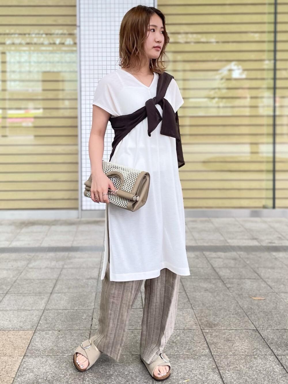 ●身長:161cm ●普段サイズ:ボトムスM/シューズ24.5cm or 25cm 【サイズ感】 ワンピース:ゆったり 肩にかけたカーディガン:ゆったり ボトムス:ウエスト・幅ゆったり、丈長め シューズ:標準 【素材感・着心地】 ワンピースとカーディガンはトレンドの楊柳生地で軽く、シワも気にせず楽にお召しいただけます。どちらも透け感がある為、インナーは必須です。 【コーディネートポイント】 全体的に優しいホワイトとベージュでまとめました。ぼんやりとした印象にならないよう、肩にかけたカーディガンを黒よりも柔らかい色のダークブラウンにし、色浮きせず、コーディネートを引き締めています。ボトムスを色物のスカートにすれば女性らしく、デニムにすればよりカジュアルにお召しいただけます。