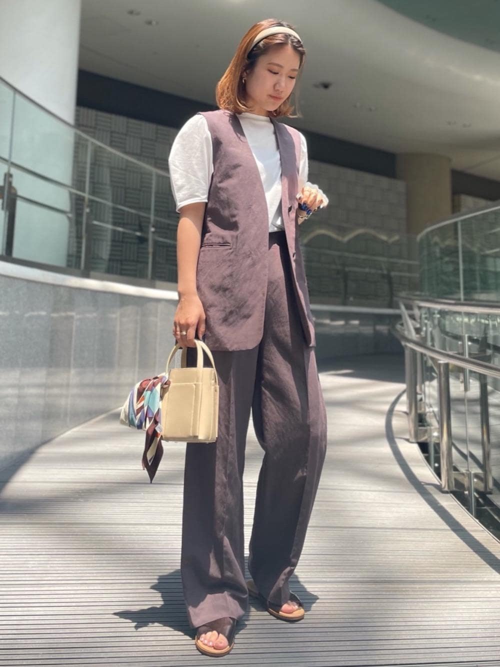 ●身長:161cm ●普段サイズ:ボトムスM/シューズ24.5cm or 25cm 【サイズ感】 トップス:肩周りゆったり ベスト:標準 ボトムス:ゆったり シューズ:標準 【コーディネートポイント】 セットアップのマニッシュさにフェミニンなパフスリーブと幅広なカチューシャを加えてレトロ感のあるコーディネートに。足元はラフに履いていただけるフラットサンダルを着用して、抜け感をプラス。普段、パフスリーブのような可愛らしいお洋服を着ない方でも、合わせ方次第ではモードやカジュアルな雰囲気で楽しんでいただけます。