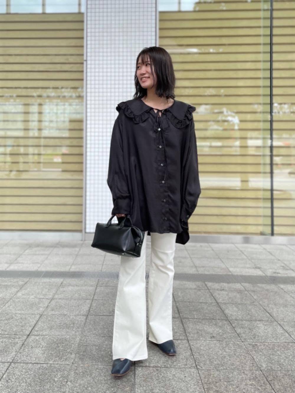 ●身長:161cm ●普段サイズ:ボトムスM/シューズ24.5cm or 25cm 【サイズ感】 トップス:ゆったり ボトムス:ウエスト大きめ(通常よりワンサイズ小さめがおすすめ) シューズ:標準 【素材感・着心地】 トップス:柔らかく、とろみのある生地 ボトムス:ストレッチの効いた生地で履き心地が良い 【コーディネートポイント】 甘くなりそうな襟付きのサテンブラウスはモノトーンでまとめていただき、デニムと合わせてカジュアルダウンするのが個人的におすすめです。<Shinzone>別注のデニムは毎日履きたくなるような着心地の良さで、程よく女性らしさのあるフレアタイプです。Tシャツやブラウス等、さまざまなトップスとの合わせをお楽しみ下さい。