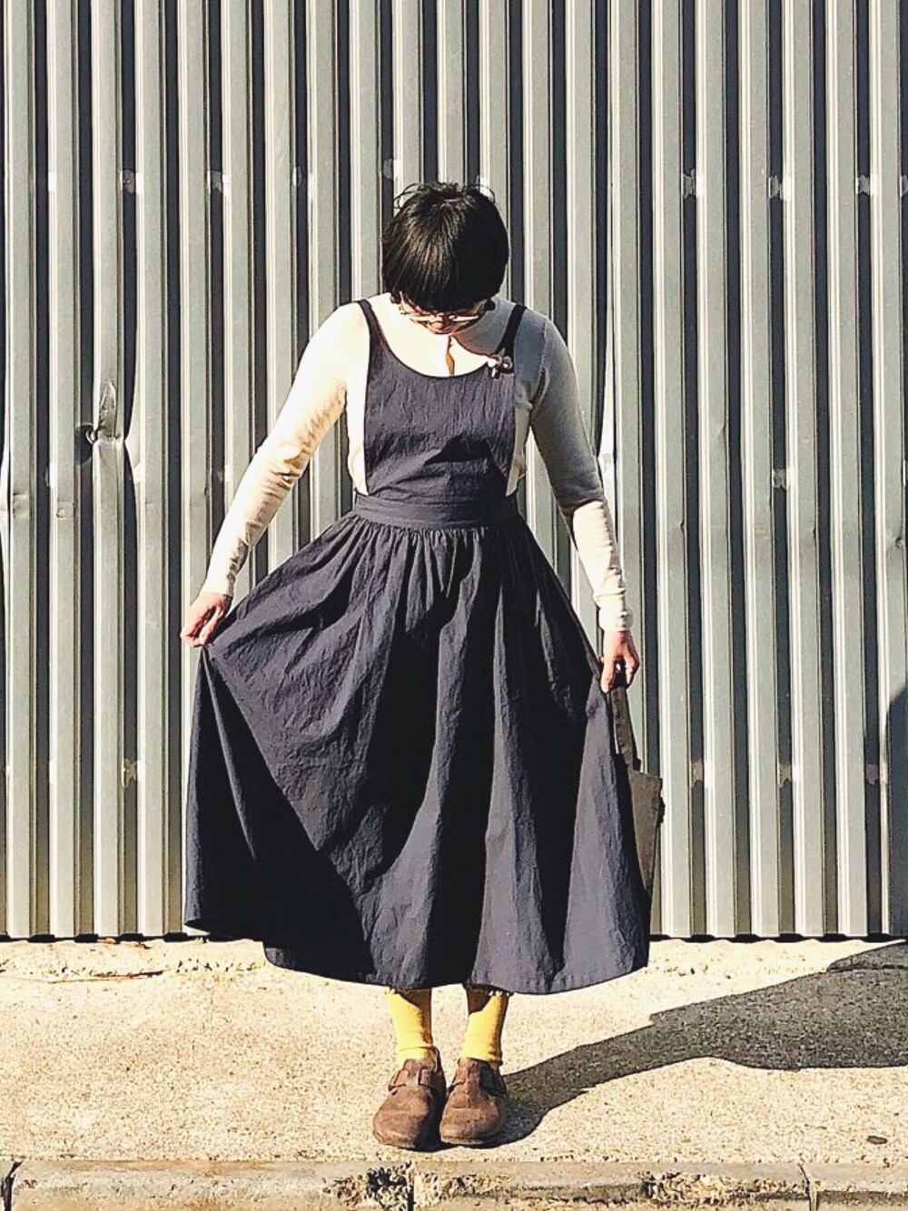 母が作ったエプロンワンピース。後ろのサスペンダーをゴムで留めてるから屈んでも楽ちん。