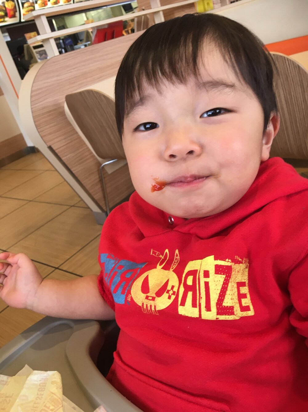 ハンバーガー食べた後の口のケチャップがポイント(๑>◡<๑)