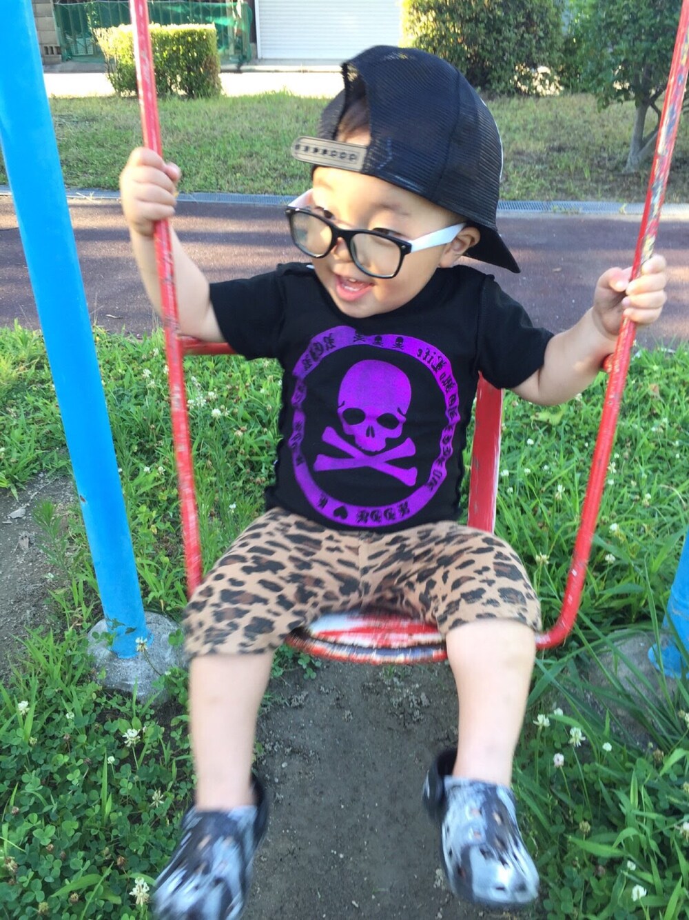 お気に入りのTシャツで公園でブランコしてます