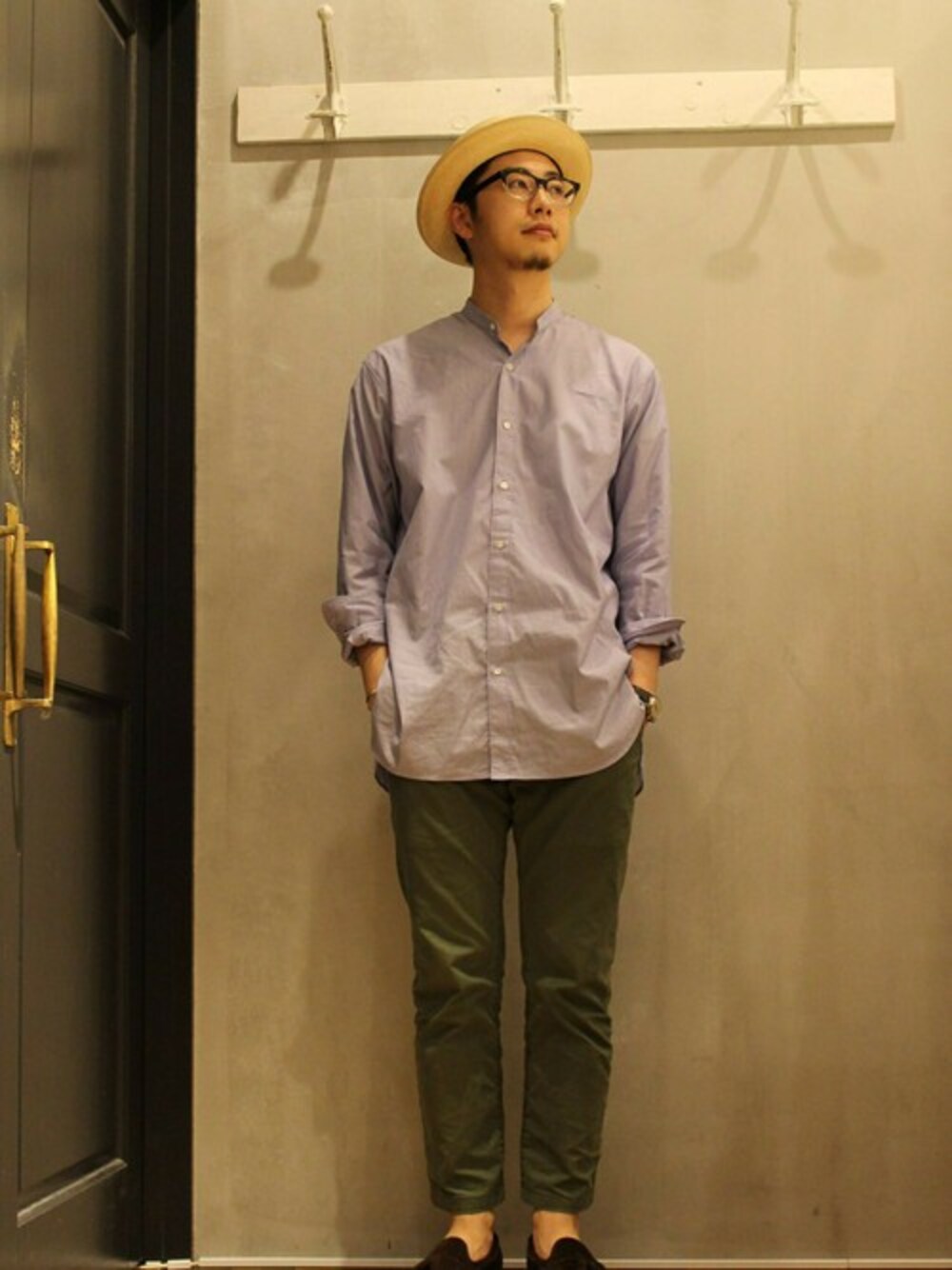 今季トレンドのバンドカラーシャツ 少しオーバーサイズなデザインは1枚で主役になります。 また綺麗な生地感なので綺麗目スタイルにもハマりやすい1着。 コーディネートはシンプルになり過ぎないようハットでアクセント。 シンプルですが小慣れ感あるスタイリング。