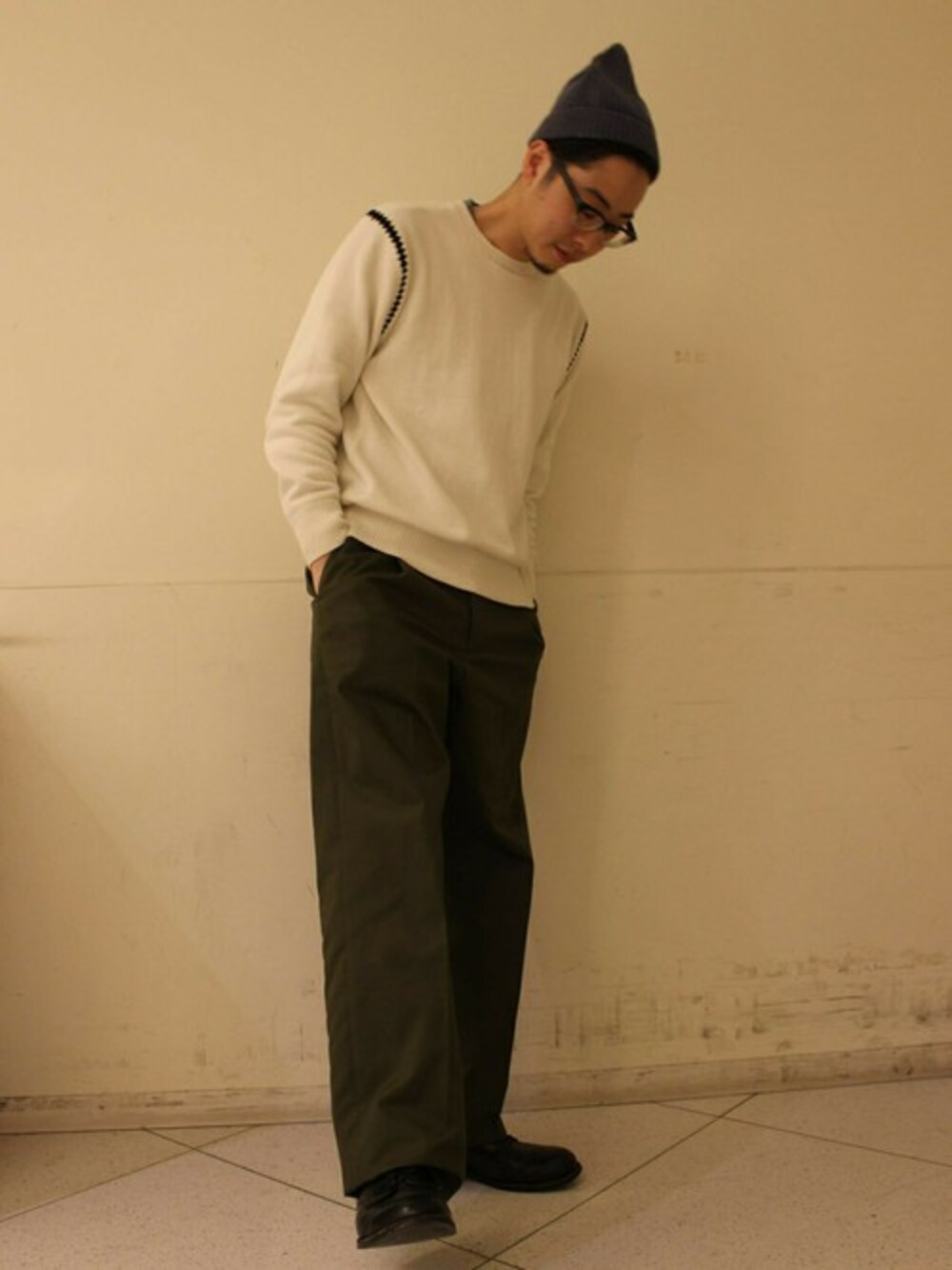 春らしいウォッシュドのコットンニットキャップでクリーンな中に気負い過ぎないラフなイメージ 。 シンプルながらワイドパンツが 程よいアクセントになっています。 さり気ないお洒落って良いですよね。