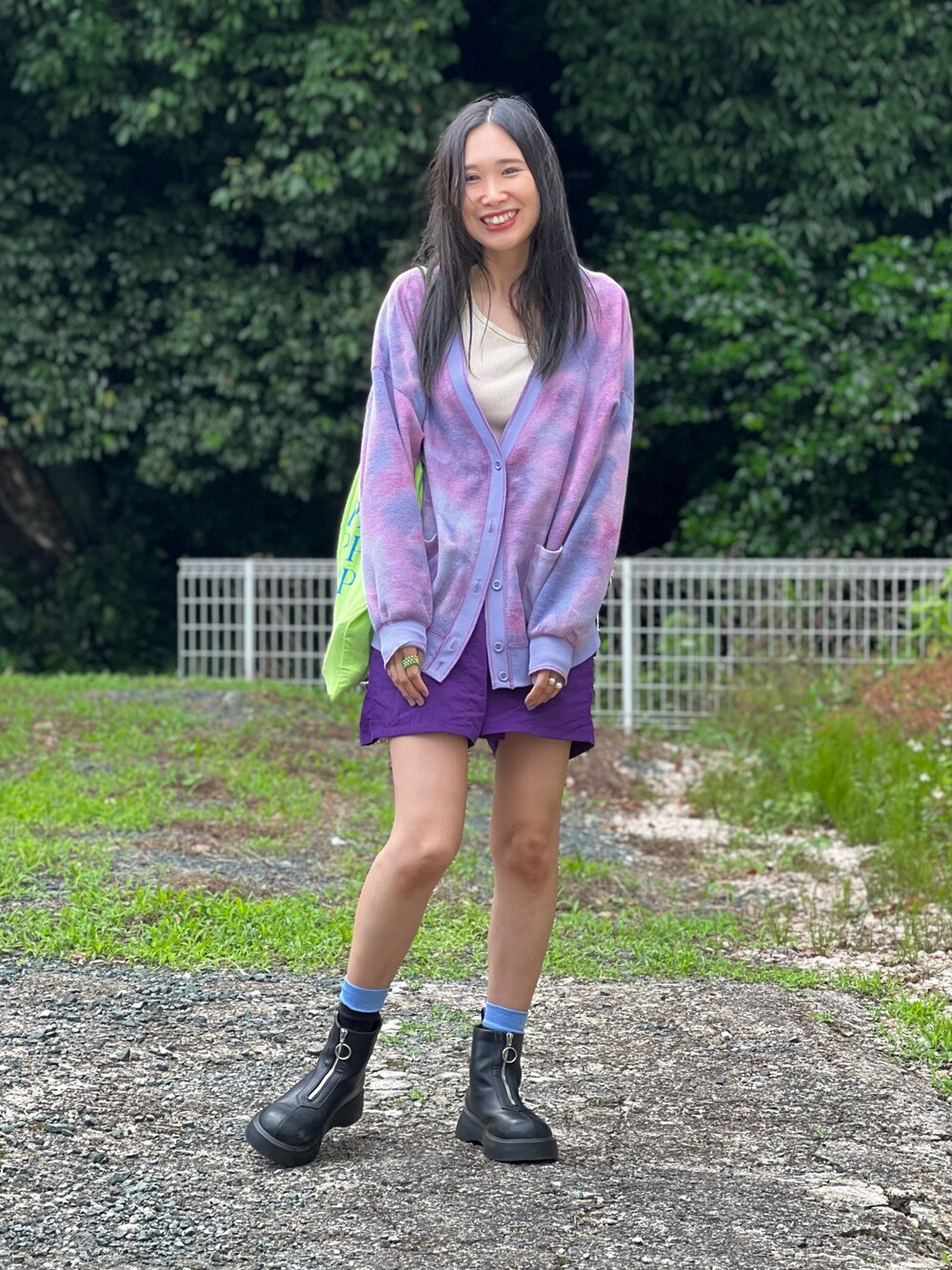 パープルな休日🪻 雨降って肌寒くカーディガンでした! ショートパンツをはきたくて紫コーデにしちゃった🥳ネオンカラーも入れちゃって 余談になりますが 友達がリーのサロペットをzozoで買って着ててくれて嬉しかったです。まさかのオソロ🙈一緒にお買い物したまた別の友達はオソロのビーズリング買ってました笑 嬉しなぁ🥺 他にも嬉しいこと楽しみなこと盛り沢山で‥♡嬉しい、幸せとかって伝染するのね⚡️ 見てくださりありがとうございました🫱🏻🫲🏼
