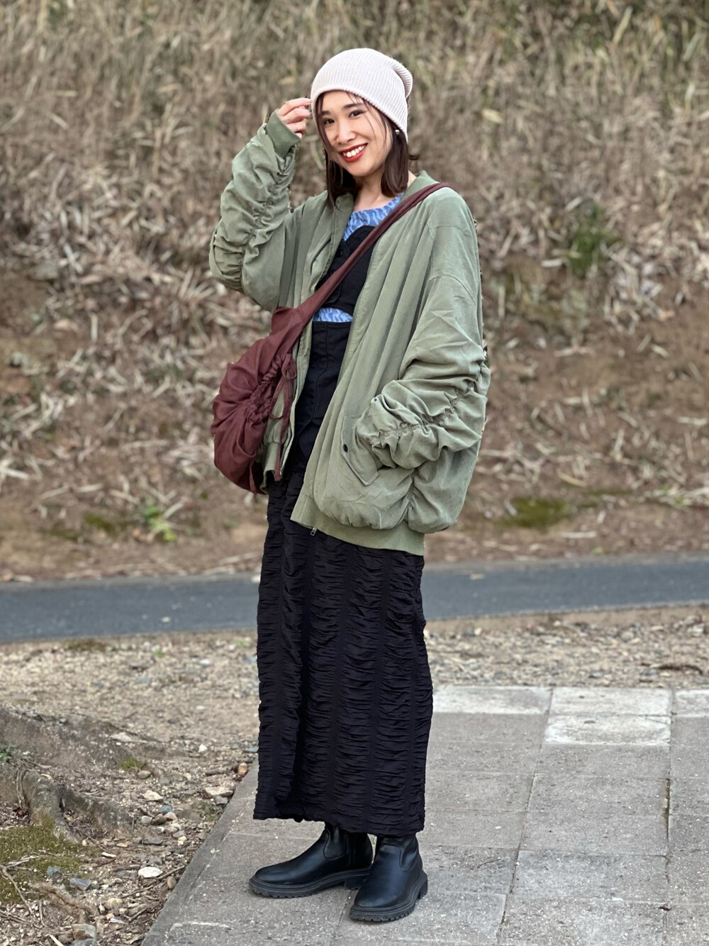 あみぃのMA-1「【LVEU.】ルーズギャザーMA-1ブルゾン / アウター ブルゾン MA-1 ビッグ オーバー ギャザー ミドル カジュアル ストリート ミリタリー ブラック グレー カーキ」を使ったコーディネート