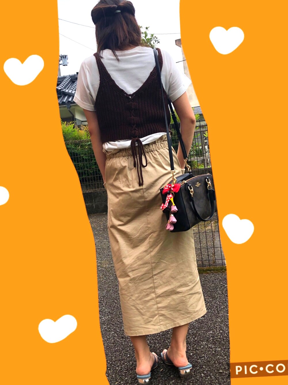 プチプラコーデになってしまった けど、しまむらのビスチェの裏編みはお気に入り。 勇気のいるビスチェデビュー🧡🧡 可愛いいから全然着れる〜〜🙋♀️💓