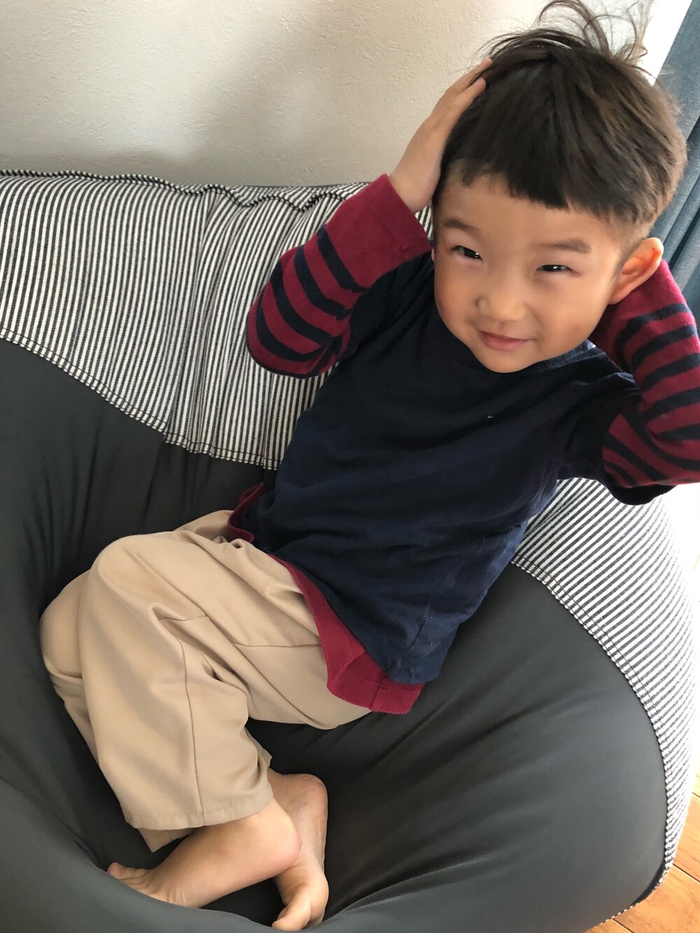 すごーく リラックスしていますw 今月から保育園デビュー♡♡ こんなのんびり屋の息子 頑張ってほしいな( ˙◊˙ )💦 今日ゎ エイプリルフール そして新元号発表の日♩ どんな感じなんだろ?♡ 昭和と平成... どんなときも平和であってほしいです♡♡ シマシマトップス ブカブカだったころが懐かしい♡ ネイビー×ボルドー 好きです❤︎