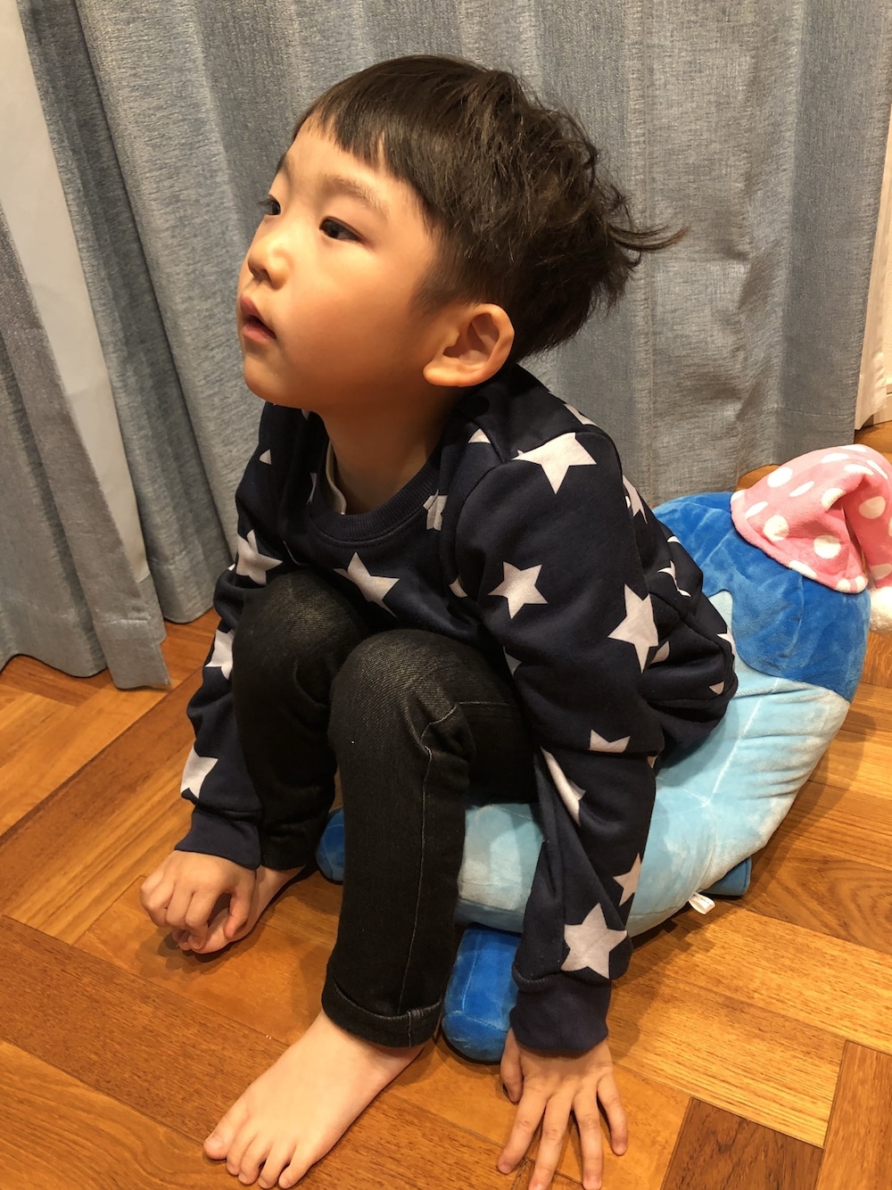 朝からの寝癖w 直らないまま保育園から帰宅(・_・) 今日で今年の保育園は 終了です*° よく頑張ったな♡ コッシーのぬいぐるみは 彼の椅子w 確かにコッシーは椅子だけど... いつかぺちゃんこになっちゃうんだろうなw 裏起毛の西松屋トレーナー✩. 20%offで買えました♩