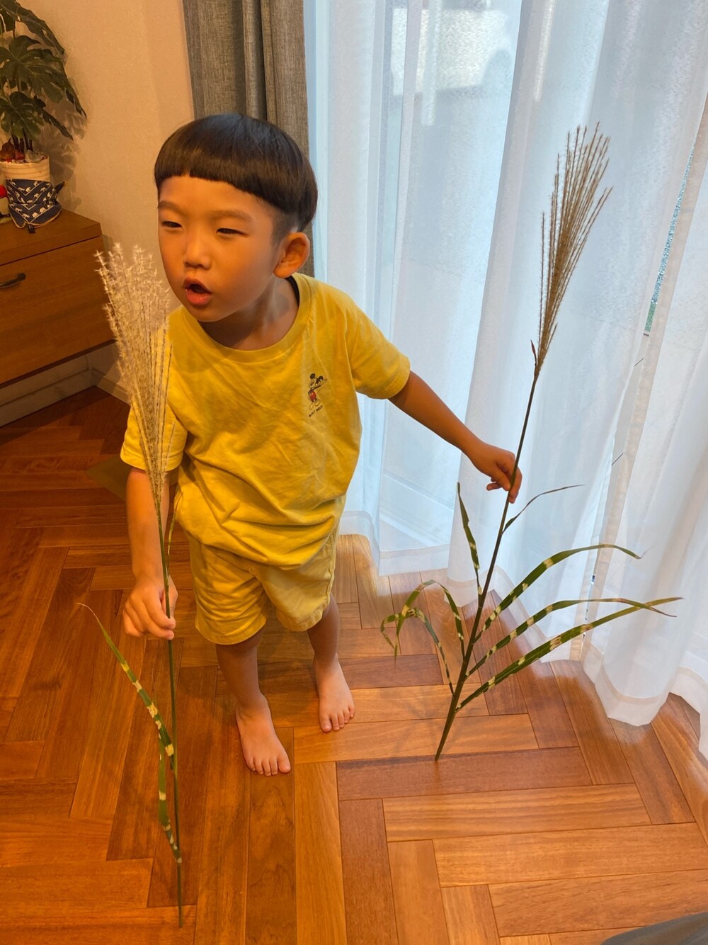 保育園から帰ってきたら まさかの YELLOW星人っ!! 保育園のお着替えストックから 自分で選んで着替えたようですが… ワントーンコーデ成立してる(T▽T) 今日はお月見☆ ススキとお団子を飾ってお月見します⭐️