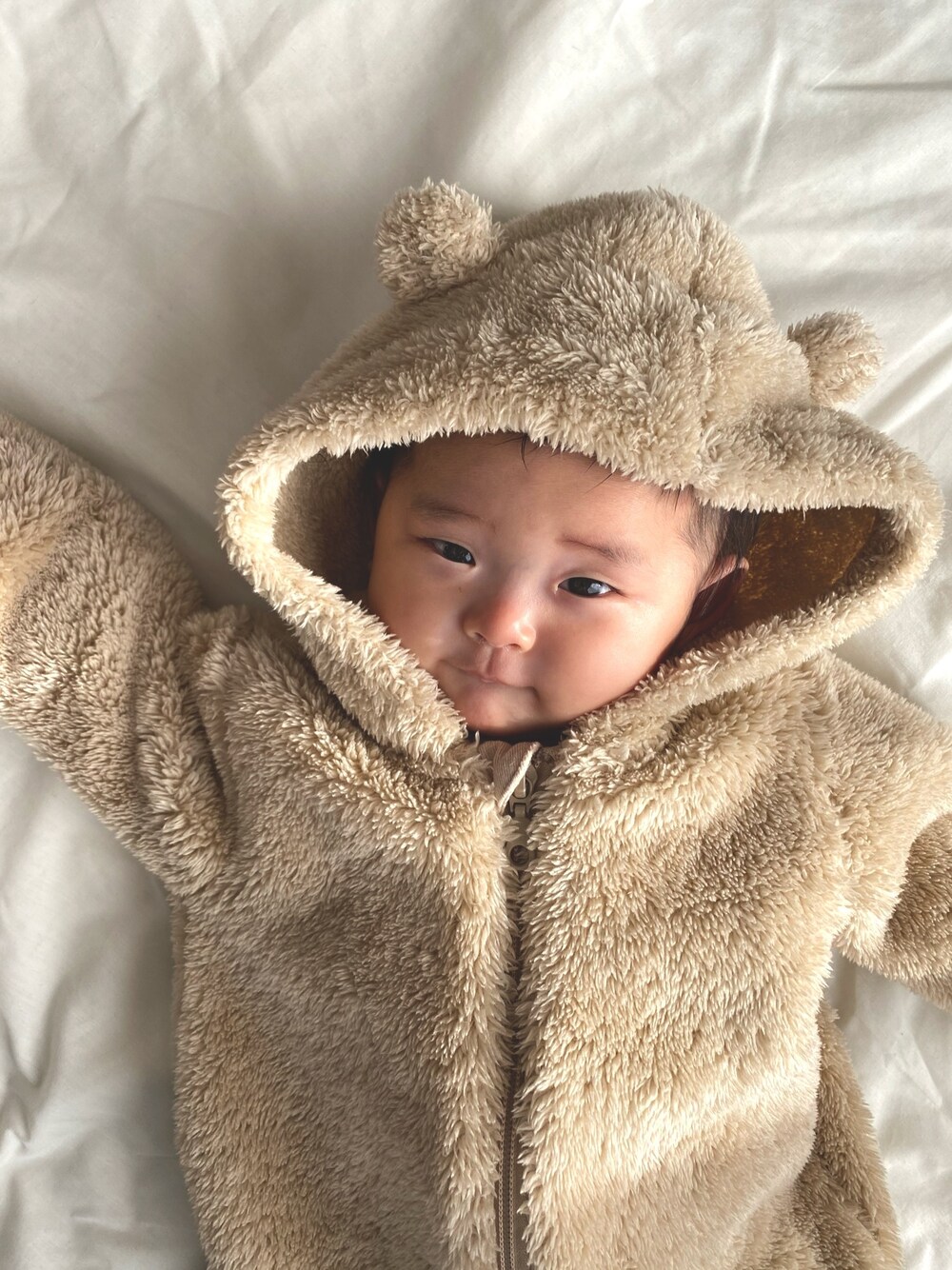 お下がりでもらった もこもこくまさん(ㅅ˙³˙)♡ ぬいぐるみみたいで 癒されるーーー(´・∀・`)♡ 生まれてきてくれて ありがとうー(⑉• •⑉)❤︎