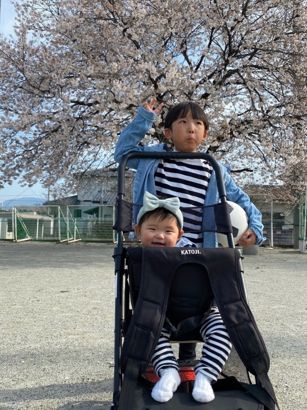 しましま×デニムリンクで お花見🌸 小学校の桜♡とっても綺麗♡♡ このカート 久しぶり⑅⃝ カートにもなるし おんぶ出来るしショッピングモールでは まぢで重宝❤ にぃにの時からの大切なアイテム(⊙ꇴ⊙)
