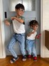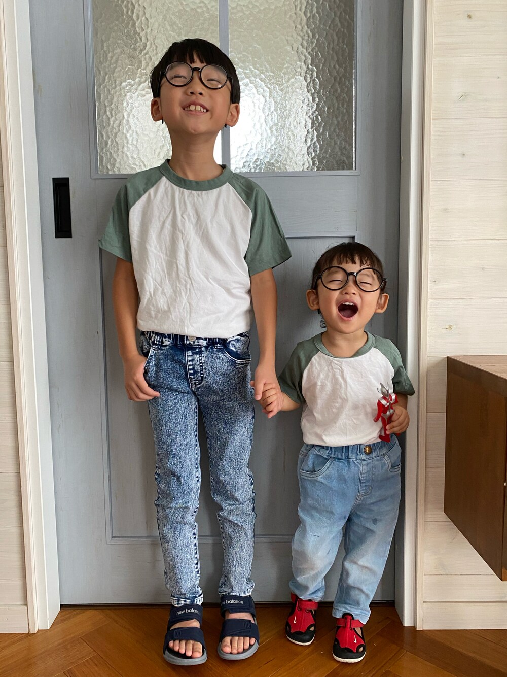 #スポーツサンダル デニム×緑ラグランT×めがねで おリンクコーデ🌿 2枚目はなぜか 踊り出す5歳差兄妹🥇 お嬢 デニムに油性マジックでまさかのペイント😱 落ちない… おてんばすぎやしませんか🙊?💦