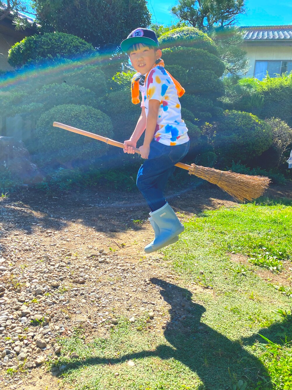 あたしの実家で草取り作業中‼️ 空飛ぶ兄者♡ 石の上のお嬢♡ ホウキで遊ぶ5歳差兄妹🥇