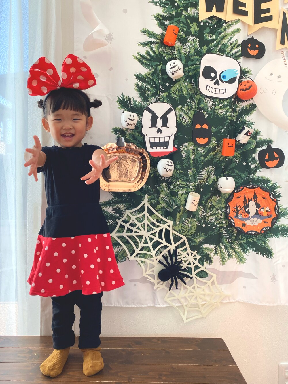 我が家のハロウィン第1弾🎃 ミニーマウスにお嬢が変身だぉ🐭🎀 スカートはお下がり🙋 まだおっきいけど ミニーちゃんになりたくて履いてみたよ♡ 本人ノリノリ( '³')~♪ おうちにあるもので 楽しんだ者勝ちっ!!♥️♥️♥️