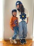 お花のトップスに一目惚れ🌼 兄者…140(身長130cm) お嬢…110(身長101cm) それぞれ2つお袖を折って 着用中☺️ 大きく着たかったからこのサイズ感も有り💗 ネイビーのニット帽でリンク🔗