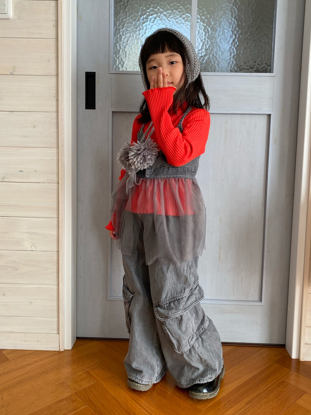 ビビットなオレンジトップス🧡 H&Mでパパが一目惚れして 購入決定♡ 今日はグレーで合わせてみたよ🤗