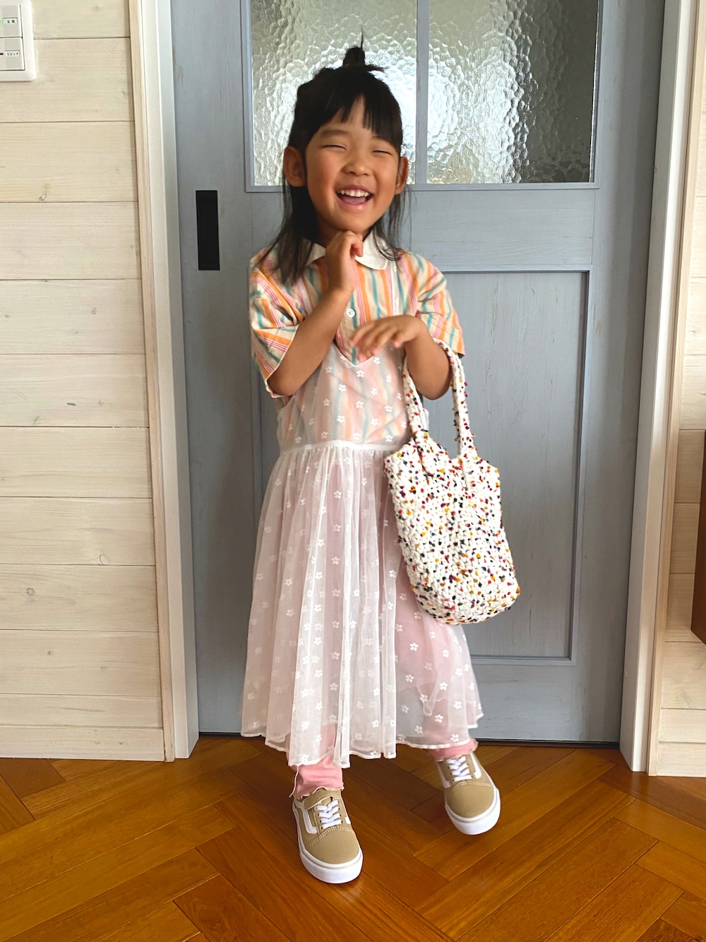 ストライプポロシャツは 今年もたくさん着るぞ💗 お気に入りのチュールスカートの下に しまむらでGETした ピンクのレギンス合わせてます🎀 size…120 ばぁばがセリアの毛糸で編んでくれた トートバッグ お出掛けによく持っていくよ💛 ポコポコな毛糸が可愛い😍