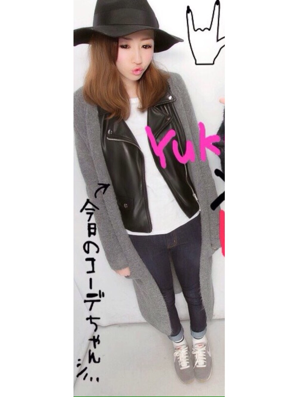 夏ぶりのあっぷ。笑 アウターおんアウター フェイクレザーとロングニットガウン。 安定のスニーカー♡