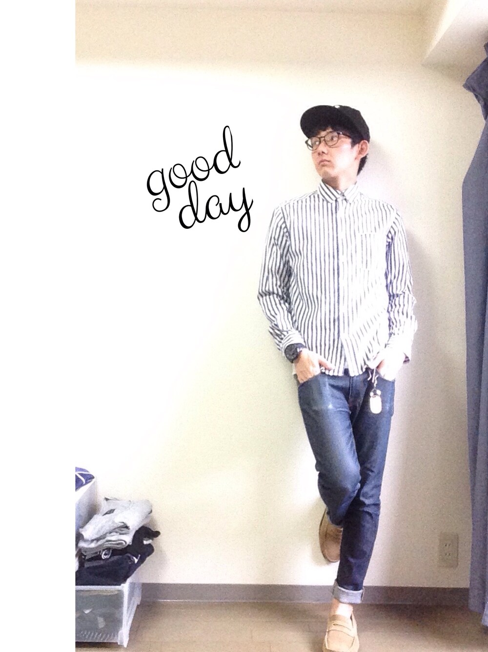 帽子:New Era メガネ:H-FUSION シャツ:adam et rope パンツ:April77 靴:YAECA ストライプシャツのシンプルコーデ。 これにスニーカーを合わせてもいい感じになるなー(^^)🎶