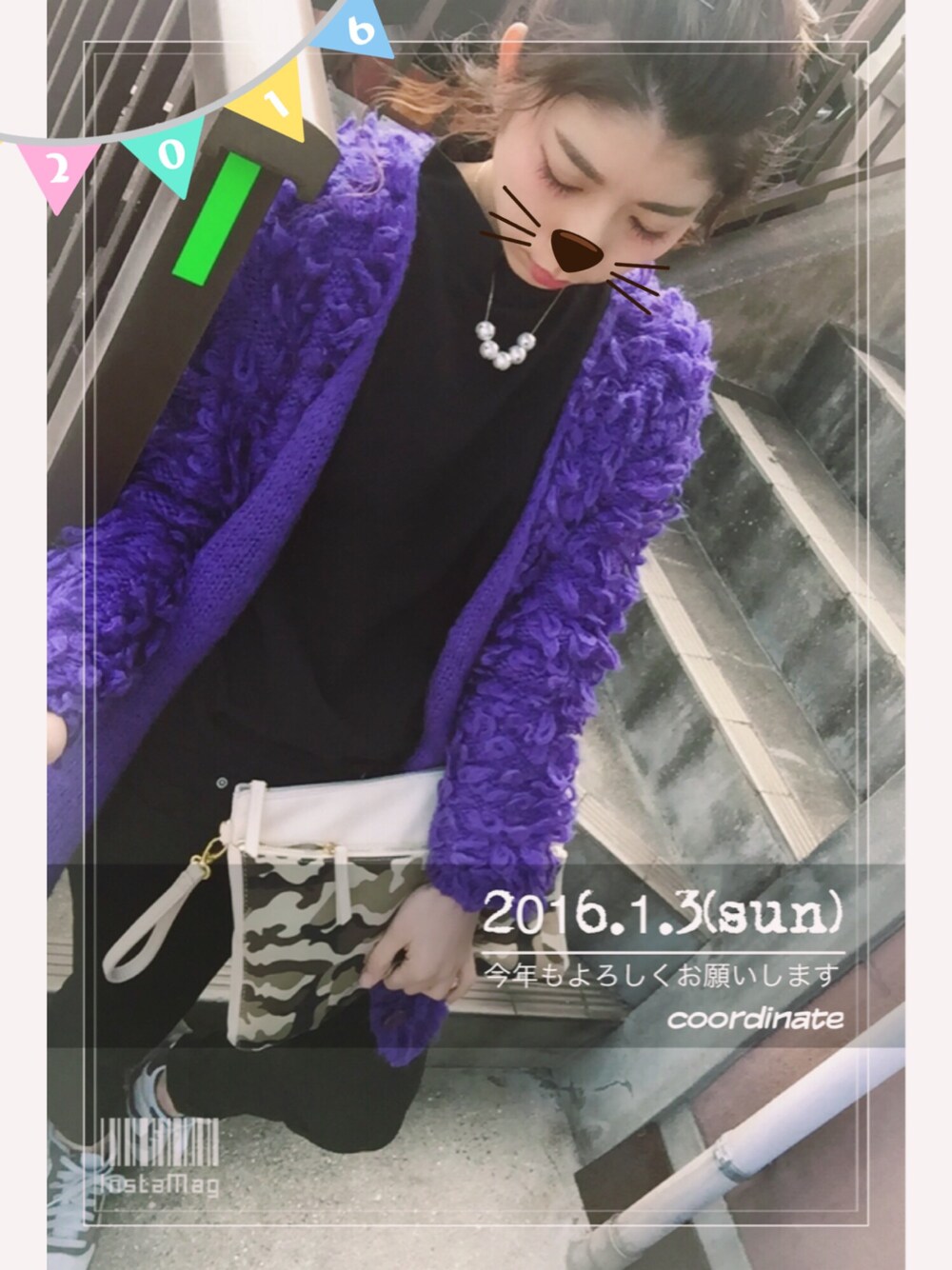 初詣だったのでパンツスタイル+スニーカー ブランド名等忘れたやつはアイテム登録なーし\(^o^)/笑 アウターが派手でボリューミーなので髪型をオールアップでバランスとってみました♪