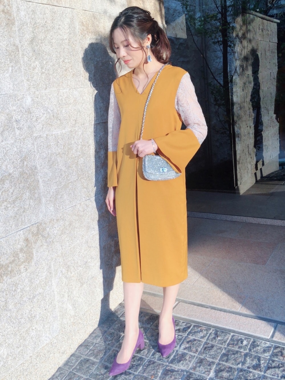 結婚式コーデ💒 珍しいくすみイエローが気に入ってこのワンピに決めました! 辺見えみりさんのスタイリングがとっても素敵だったので、真似してパープルのパンプスを合わせたのがポイント💜 カラーブロックを際立たせたくて、シルバー系の小物でまとめました✨