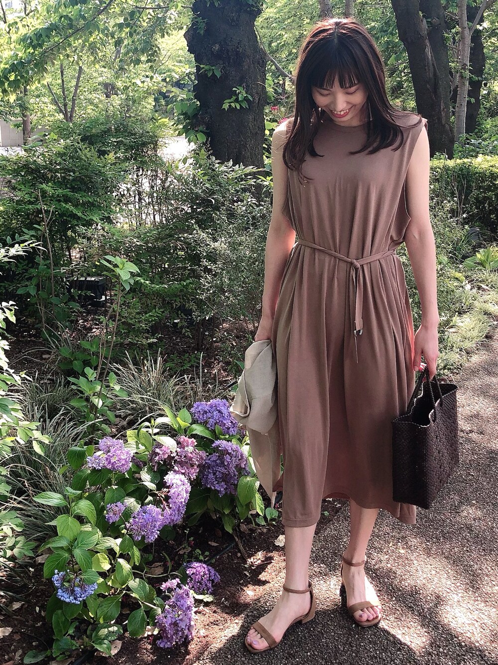 昼間すごく暑くてノースリーブになりました😄💦 バックスタイルがかわいいワンピです💕 去年黒を買って今年はベージュを買い足し🤗✨ ベルトをしないでゆるっと着ても可愛くてお気に入りです🌷