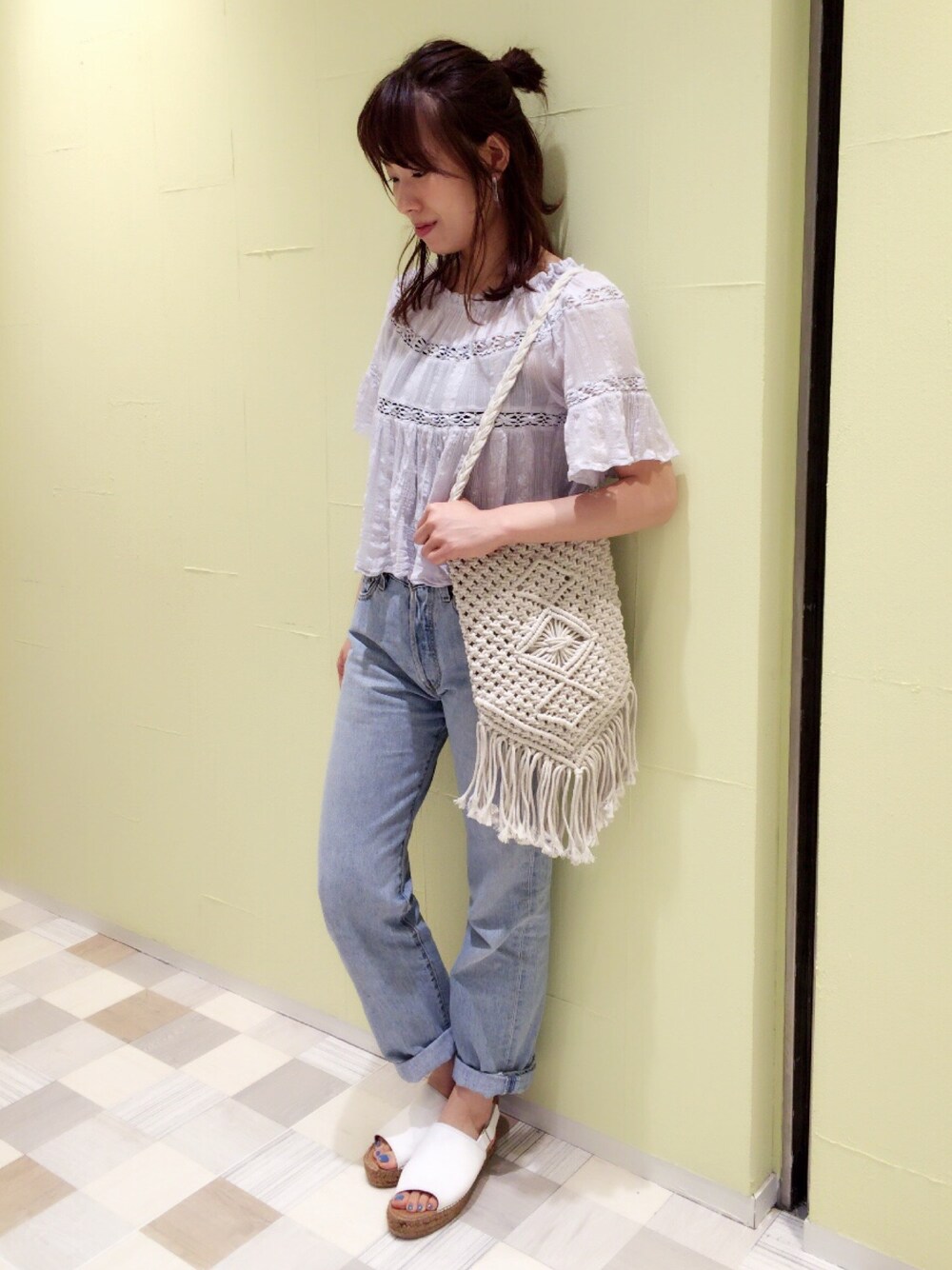 yu--kaのショルダーバッグ「マクラメフリンジショルダー(HARE)」を使ったコーディネート