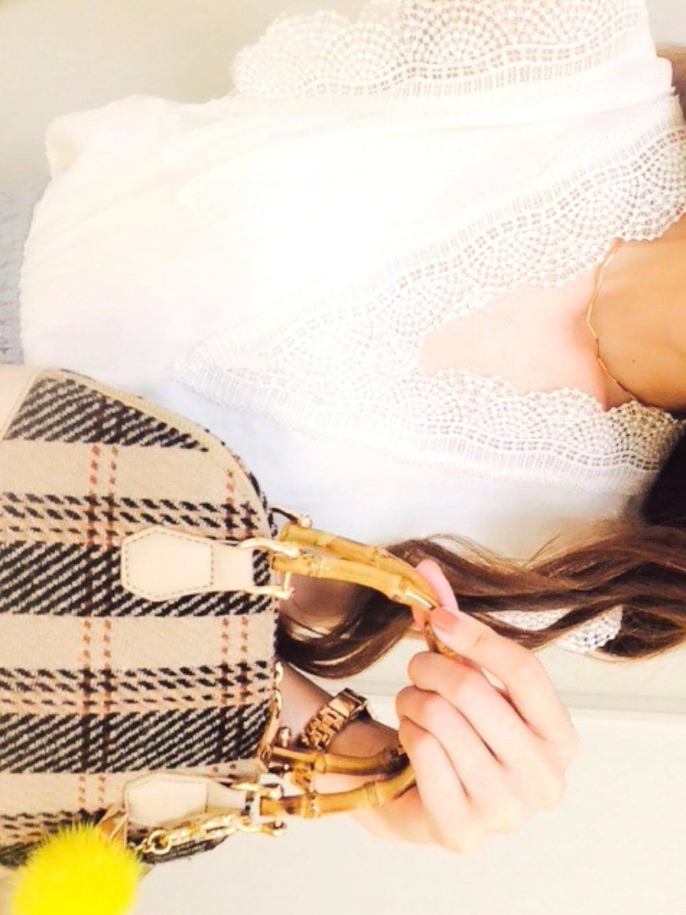 まだまだ暑いですね。(ノ_<) FRAY I.Dのノースリーブブラウスに、淡いグレーのハイウエストロングパンツに、ボルドー色のパンプスを合わせてましたU^ェ^U♡ バッグはこの前購入したチェック柄でほんのり秋らしく☆ うねうねネックレスがお気に入りです(^L^)