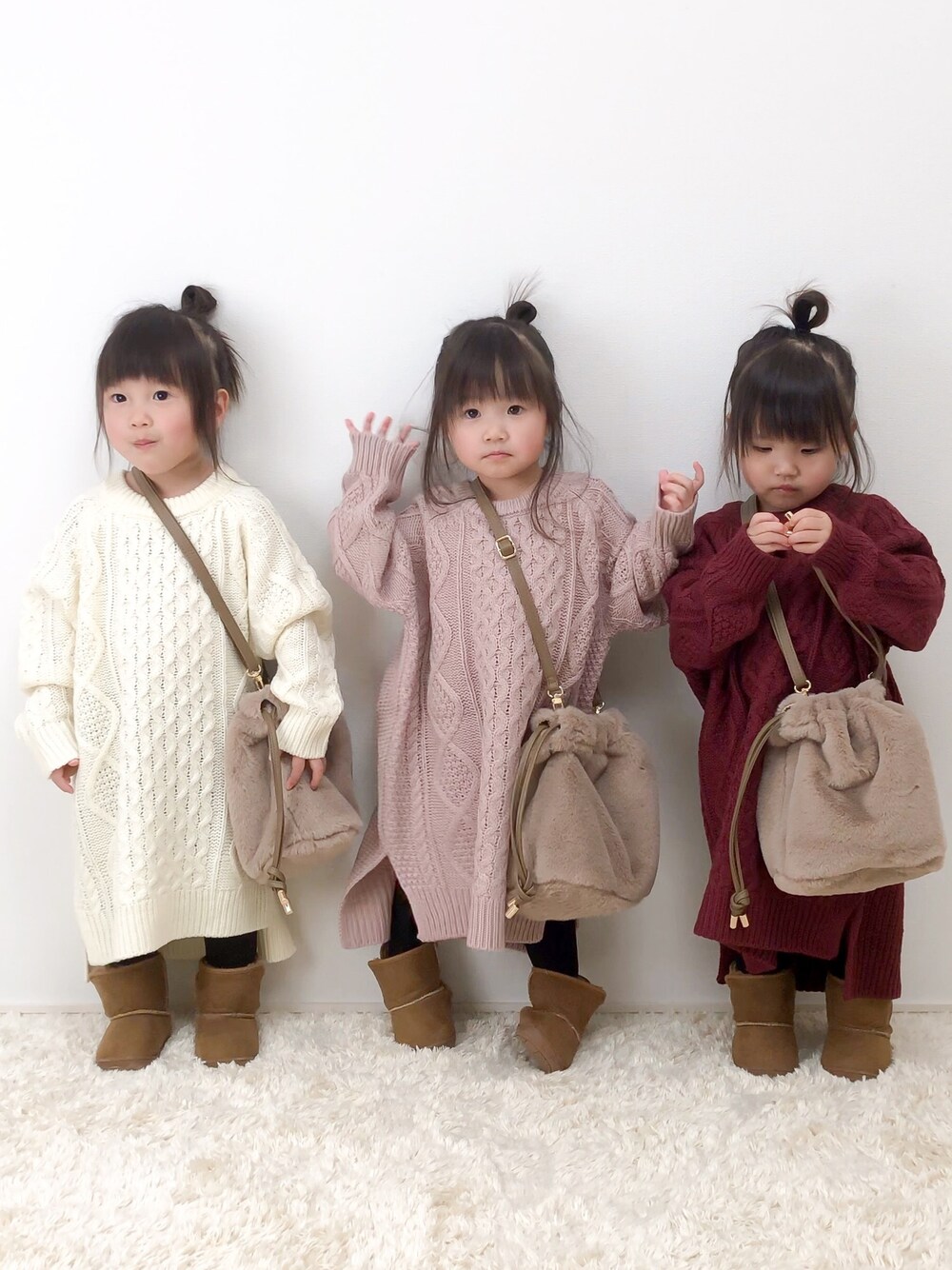 2歳5ヵ月(84.2㌢ 11.1㌔)の 三つ子の姉妹です☻໊ ☻໊ ☻໊ ニットワンピ 娘たちにも買ってみました𓈒 𓂂𓏸 ゆりかちゃんの ニットワンピ×ムートンブーツが 可愛かったので真似っこ♪