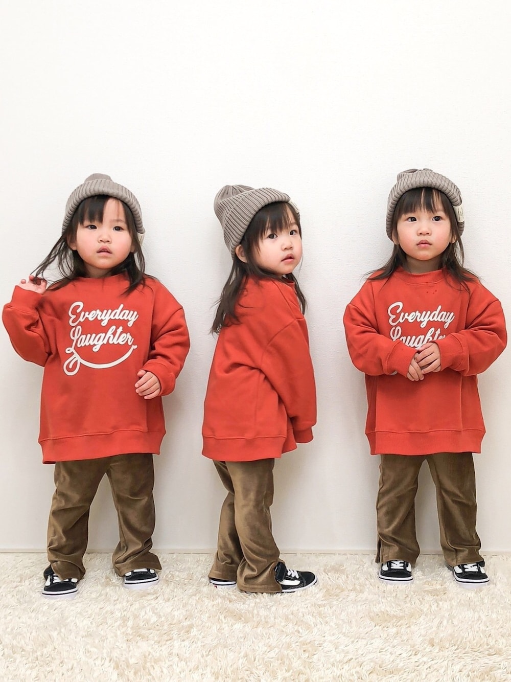 2歳6ヵ月(85㌢ 11.1㌔)の 三つ子の姉妹です☻໊ ☻໊ ☻໊ このスウェット 可愛くて プチプラで しかもセールだったので お兄ちゃんたちにも買って 合計15枚買いました◡̈⃝✩‧₊