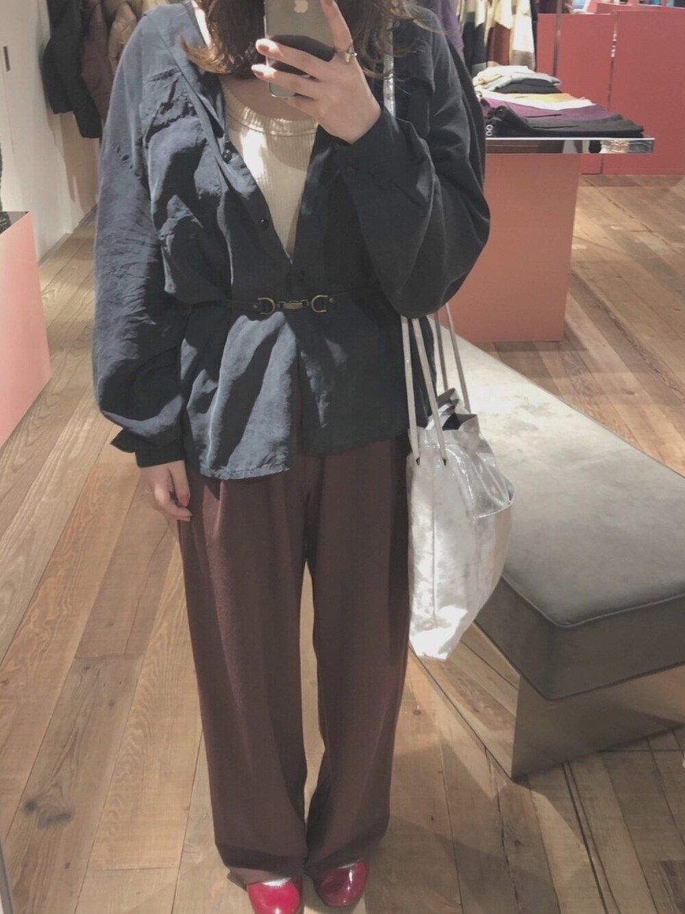全体的に緩いコーデなのでベルトでウエストマーク作りました