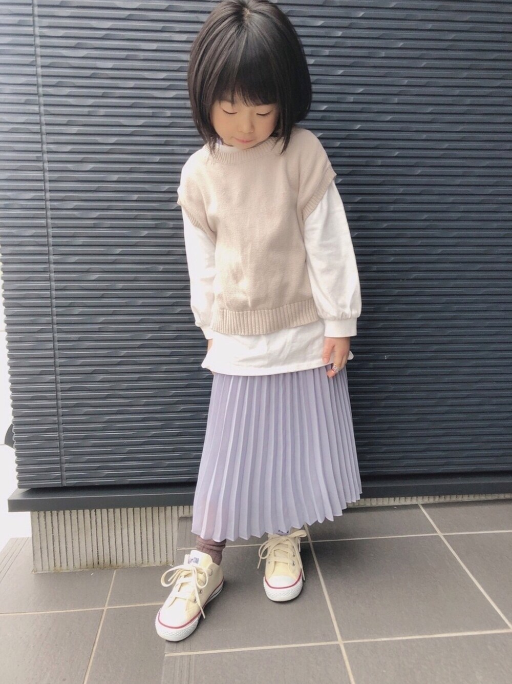 春よコイ。はよ。 ニットベスト+白ロンT+シフォンスカート