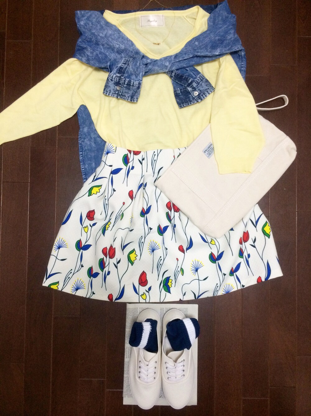 明日はお出掛けなので フレアスカートで女子らしくʢ•ꇵ͡•ʡ✩⃛ でも長時間歩きそうな気がするので スニーカーでラクな感じにしました♡。 雨が降りませんよーーーーにっ‼︎ デニムシャツ#g.u トップス#PAGEBOY スカート#dholic ソックス#tutuanna スニーカー#g.u (ブランド名本文に書けばいいの、最近気付きましたw)