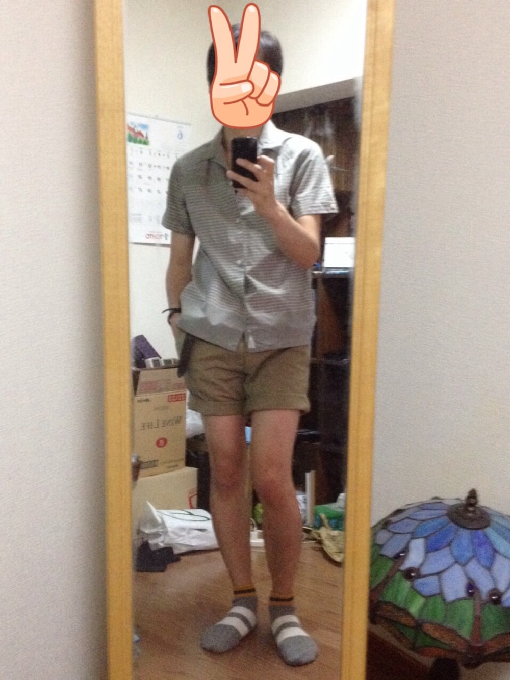 おはようございます。 数日前の写真ですが、ベージュの膝上チノショーツの裾を折り返してみました。 この方がスッキリしてかっこいいです(^^)