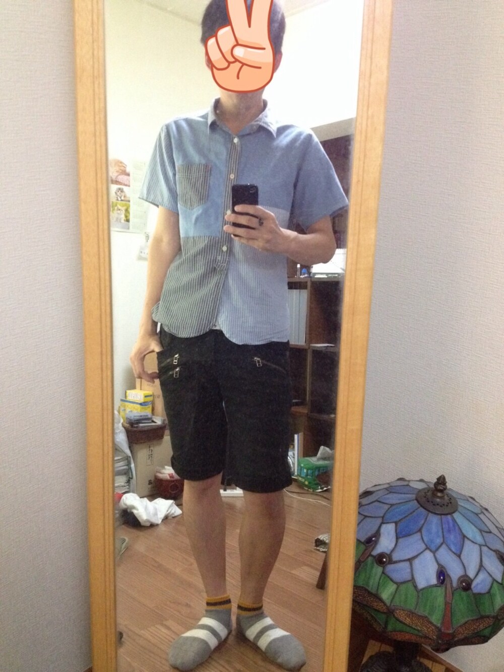 黒のきれいめ系の半ズボンにブルーのシャツのコーデです。 このシャツ可愛くて好きです。
