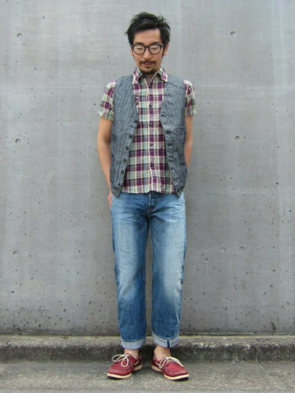 ショートスリーブシャツをベストで合わした、これからの時期に 向けてのコーディネートになります。 実際に穿き込んだ色目の雰囲気のデニムと合わせることで、 いやらしさの少ない合わせ方になるかと思います。 ショートスリーブシャツは子供っぽいと思われる方も サイズ感をシッカリ合わせて頂ければGOODですよ!!