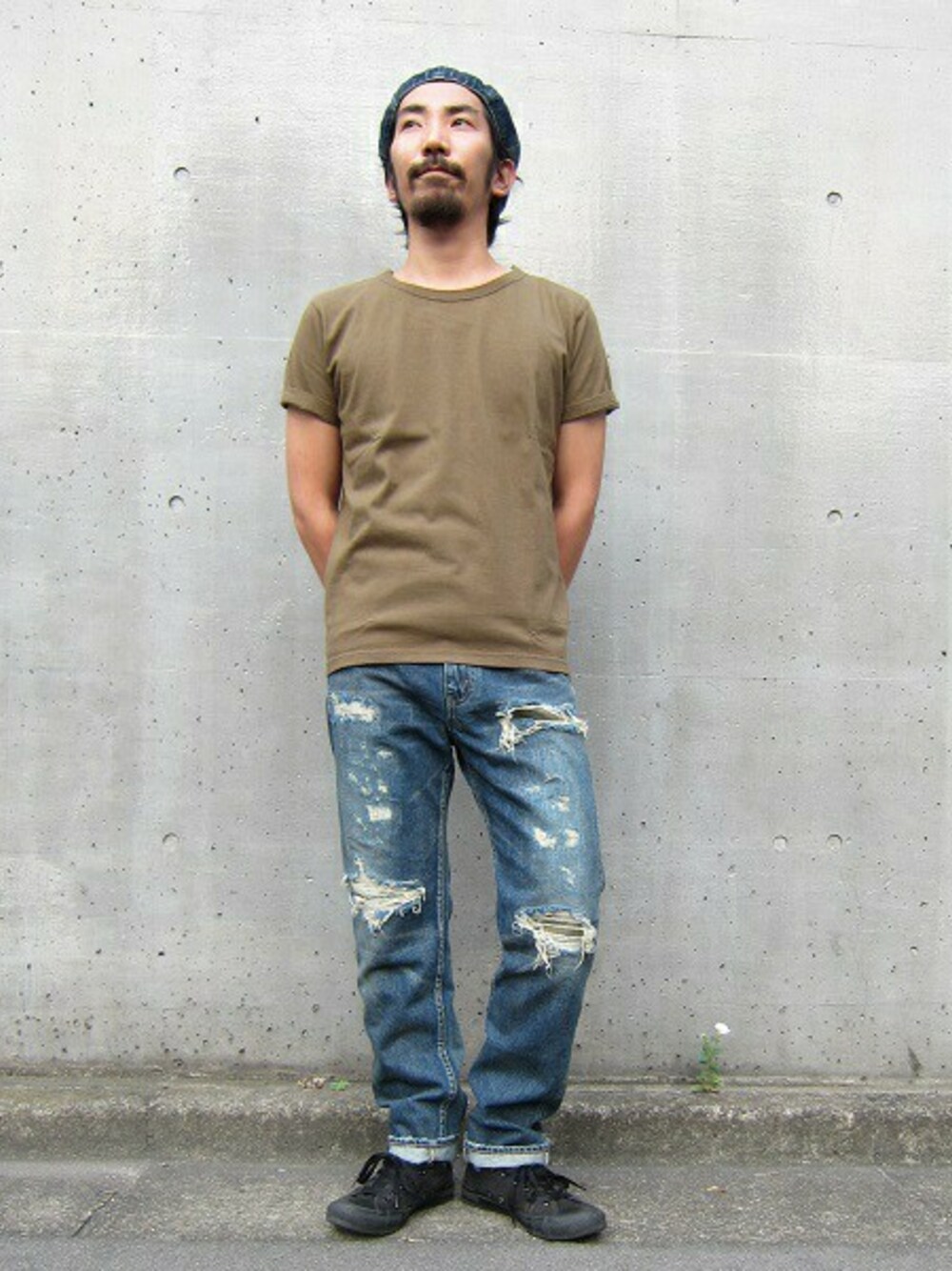 新作のダメージ&リペアをを施したデニムと、ベーシックな カットソーでのコーディネートになります。 上下のアイテムもしっかりとした素材になるので、 長年着用して味を出して行きたいアイテムになりますね。