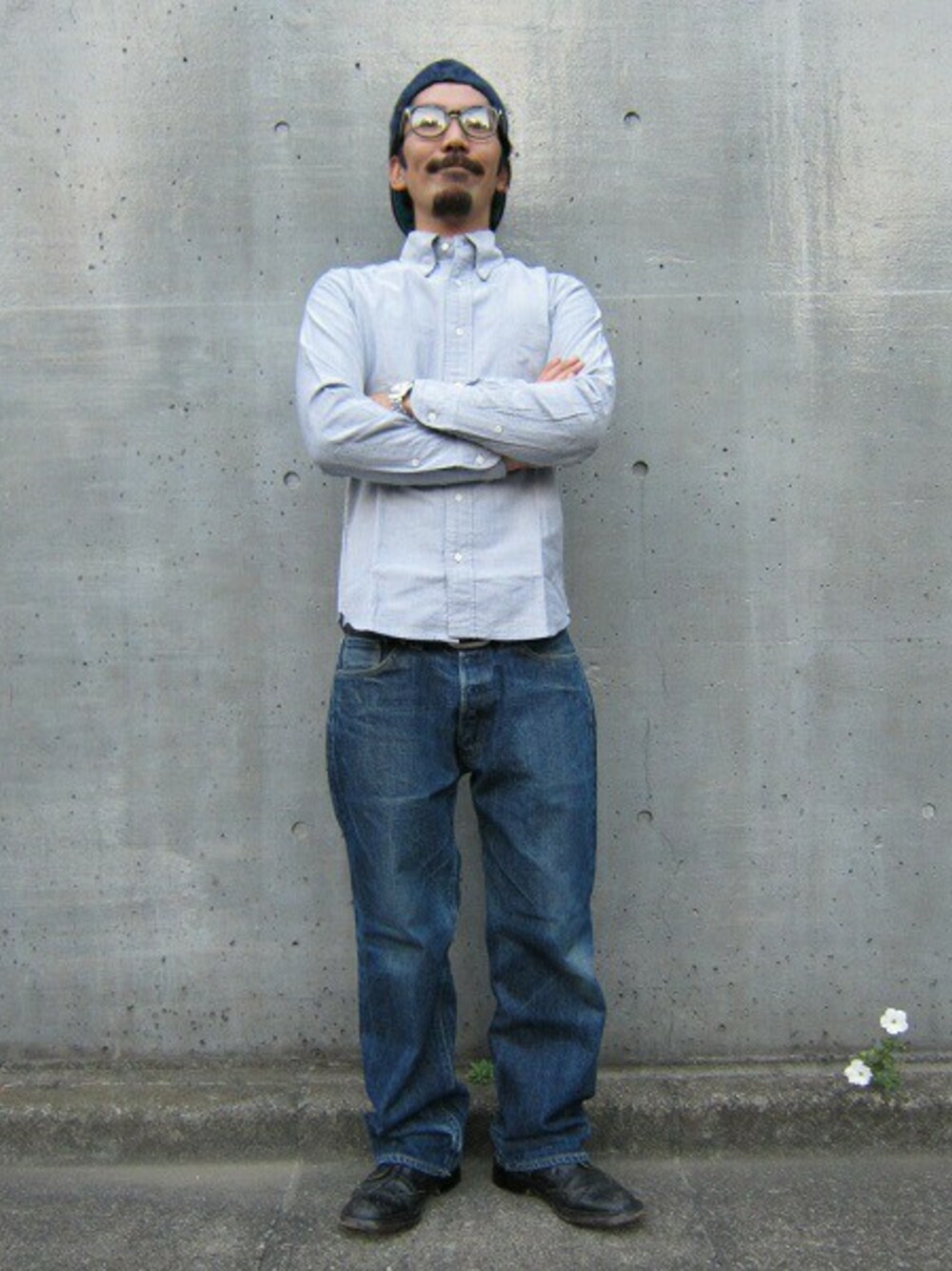 デニムパンツにボタンダウンシャツ、ベースボールCAPの ベーシックなコーディネートになりますが、 ゆるめのボトムスとジャストなトップスで少しアクセントが きいた着こなしが出来るかと思います。 ぜひサイズバランスでも楽しんで頂きたいですね!!