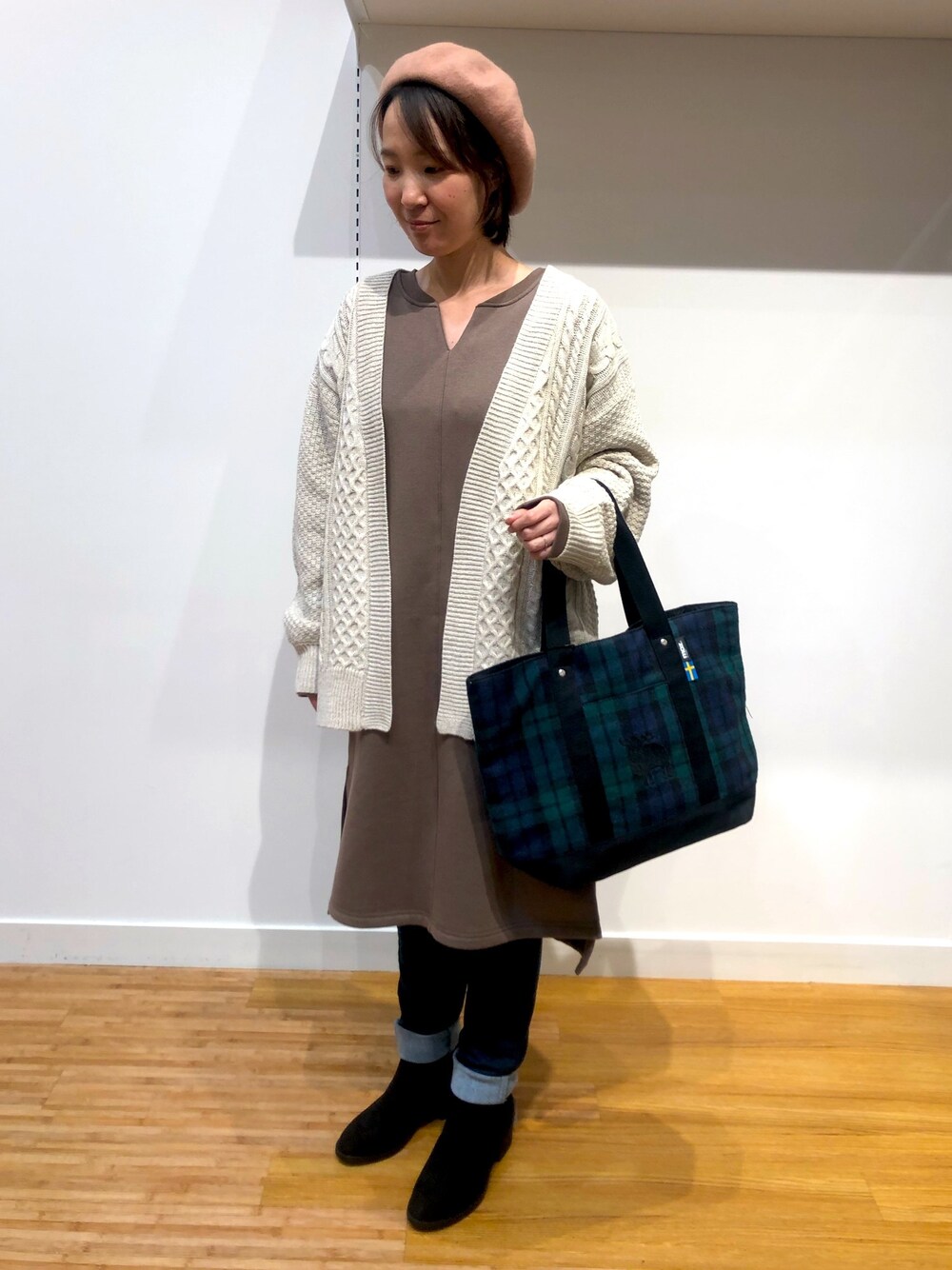 CHII(SHOO・LA・RUE)のワンピース「【M-3L/2点セット】ケーブルショートカーデ+裏起毛ワンピース」を使ったコーディネート
