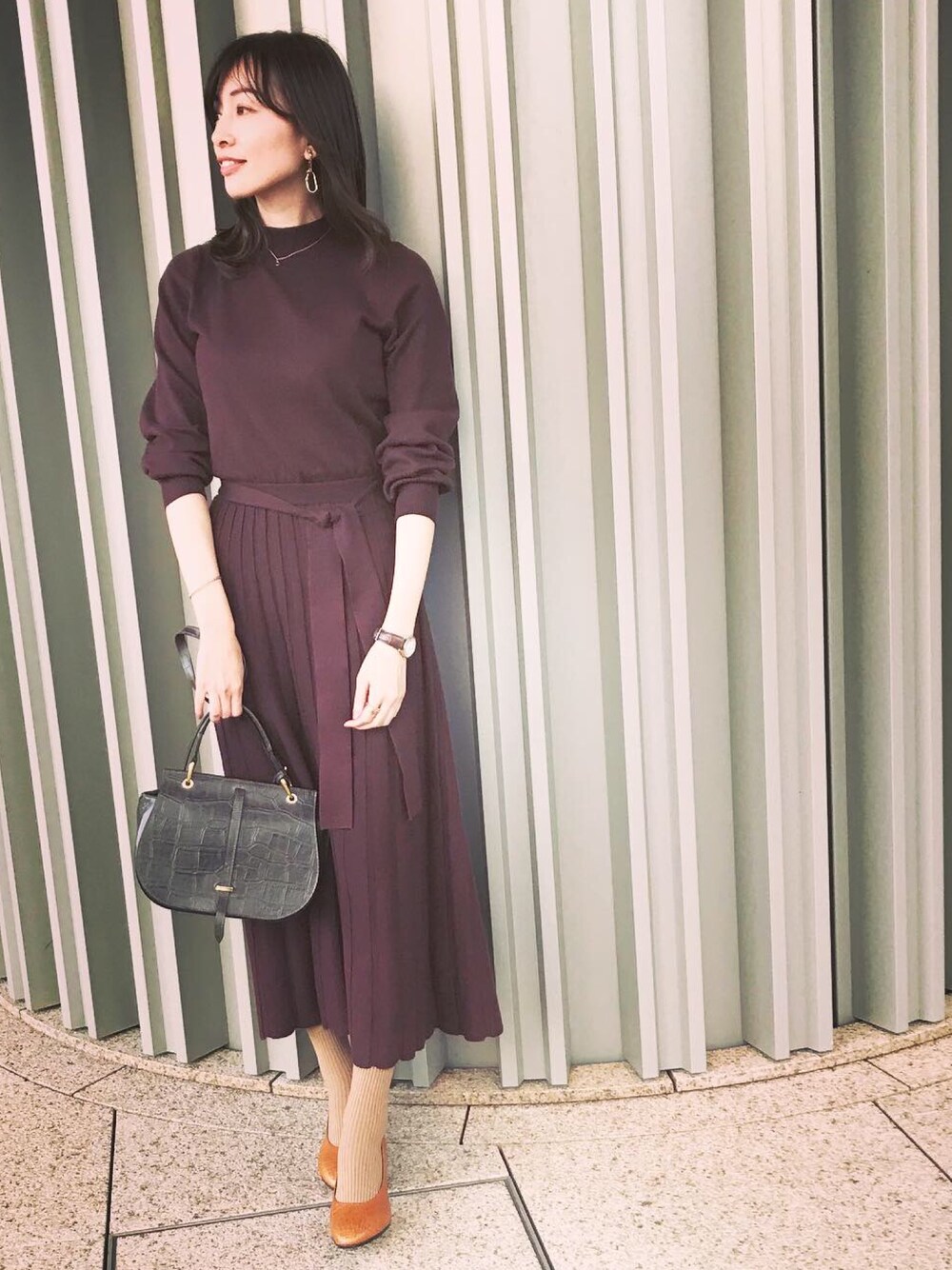 ブラウンのワントーンコーデ 大人のニットワンピーススタイル