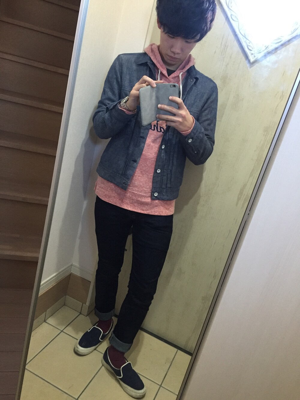 GLOBAL WORK×ユニクロ コーデ デニムonデニム!! 上半身の組み合わせはつい最近思いついて、気温的にやっと今日着れました( ̄▽ ̄) パーカーの色と同系色の靴下でチラ見せ〜