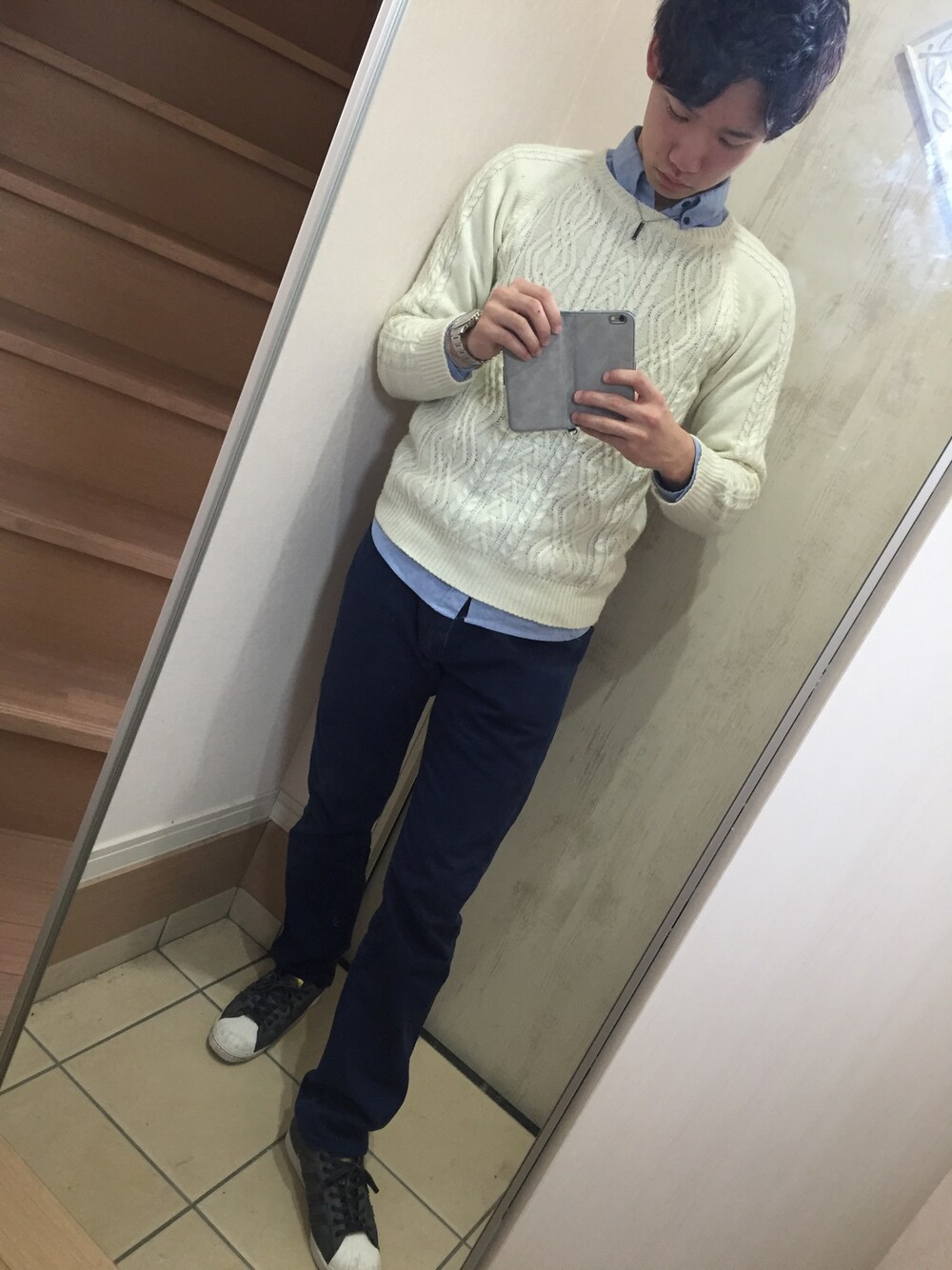 〜ニットコーデ〜 このシャツとケーブルニットの色合いが気に入っています! シャツどこで買ったんだろうなー…