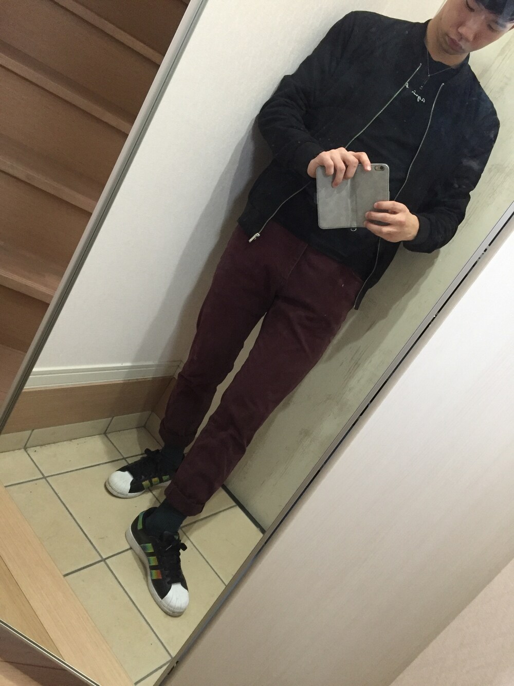 家出て早々、泥で緑パンツよごしてエンジのパンツに履き替えました… さっき投稿したコーデのパンツ違いです。 雨降らないでくれー。