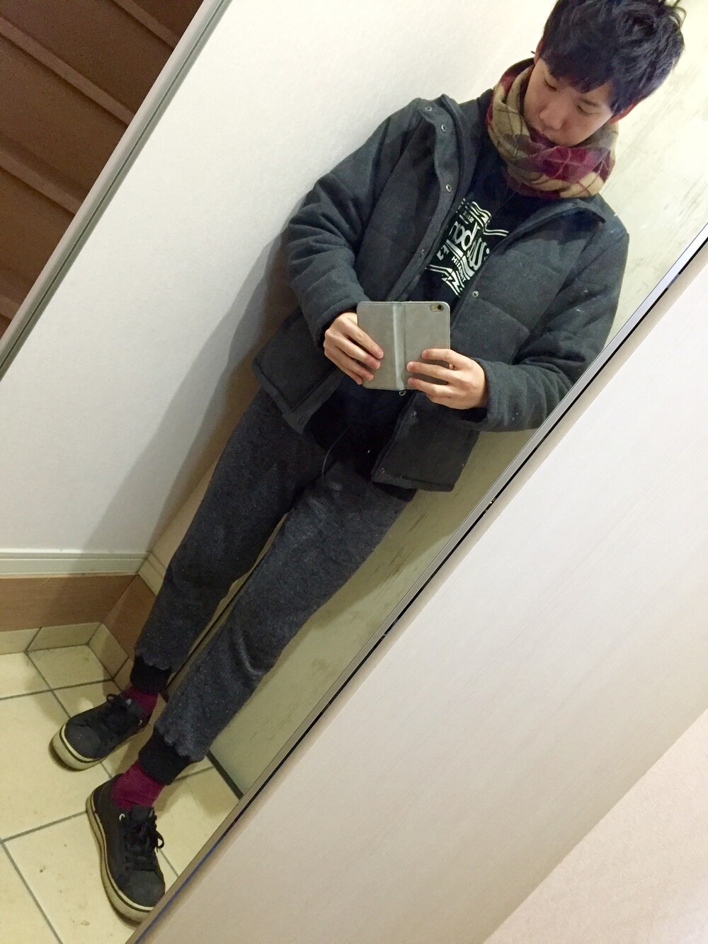 〜ゆるゆるコーデ〜 いつもキレイめだけどパーカーにダウンジャケットにスウェットでめずらしくゆるゆるに(*^^*) 靴下の色で遊んでみました😎